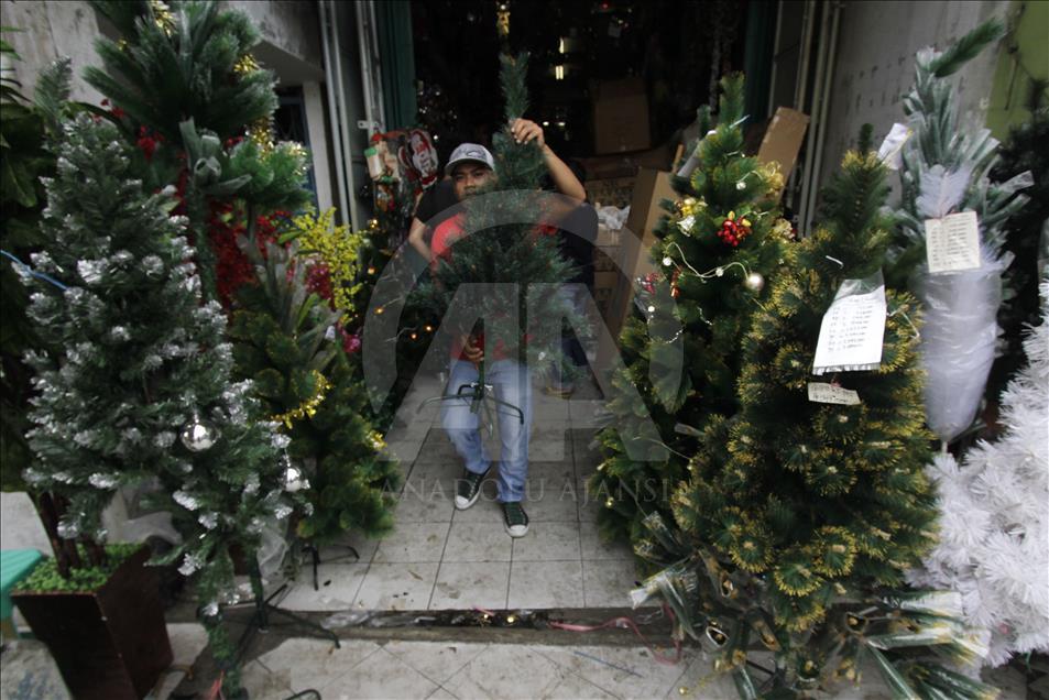 Seorang pekerja membawa pohon Natal artifisial di Pasar Asemka, Jakarta, Indonesia pada 18 Desember 2017. Berbagai pernak-pernik Natal untuk hiasan pohon dan rumah dijual berkisar dari harga Rp 5 ribu hingga Rp 2 juta, kebanyakan berasal dari Tiongkok. Eko Siswono Toyudho