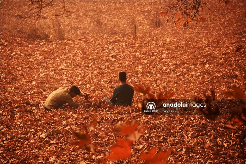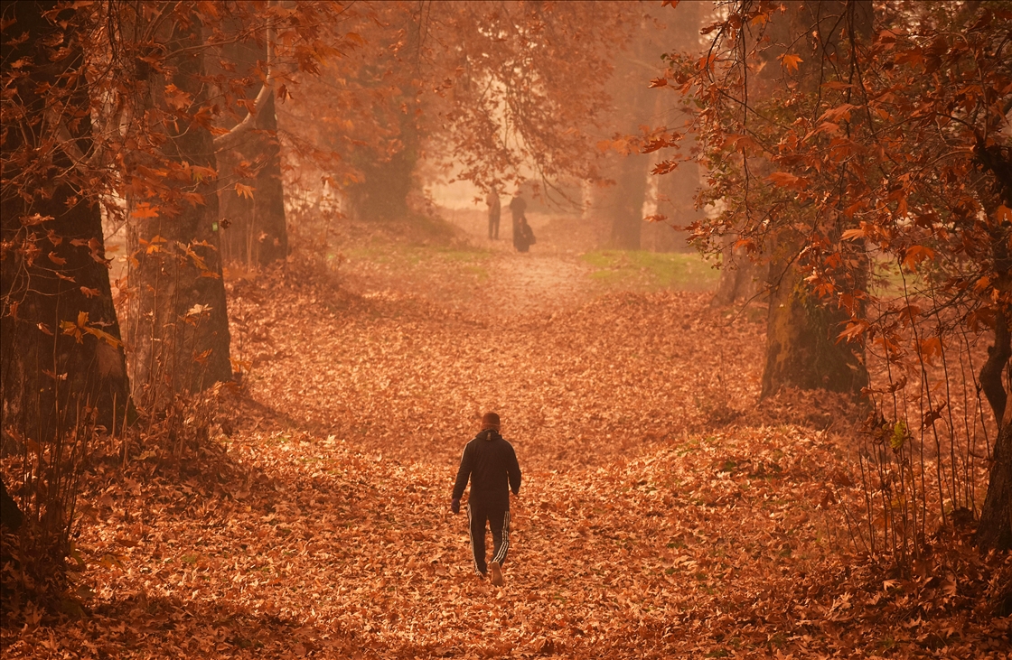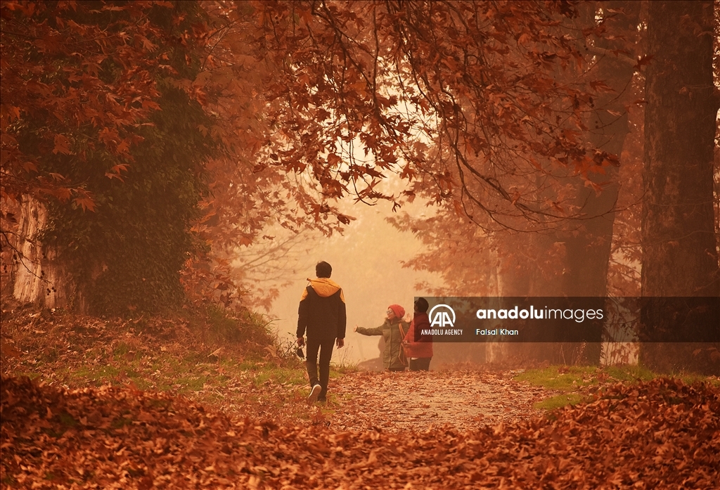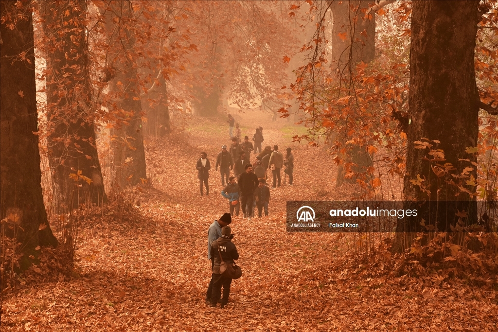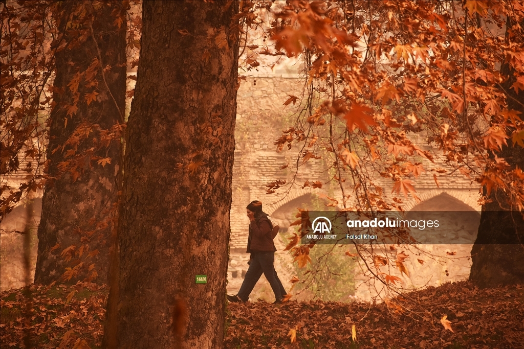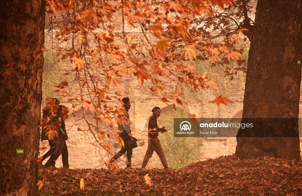 SRINAGAR, KASHMIR, INDIA - 22 NOVEMBER: Pemandangan taman Mughal yang ditutupi dengan daun-daun jatuh dari pohon Chinar pada pagi yang dingin di Nishat Srinagar, Kashmir pada 22 November 2021. Warna musim gugur mencapai puncaknya dengan pepohonan terutama Chinar yang mengubah warna mereka. Hari menjadi lebih pendek seiring dekatnya musim dingin di Kashmir. ( Faisal Khan - Anadolu Agency )Faisal Khan