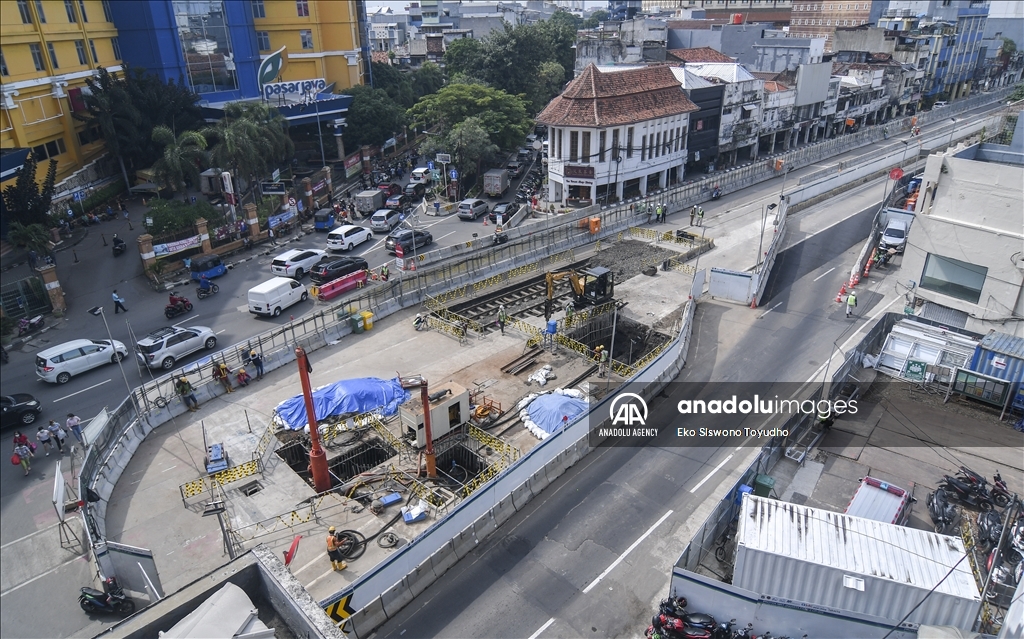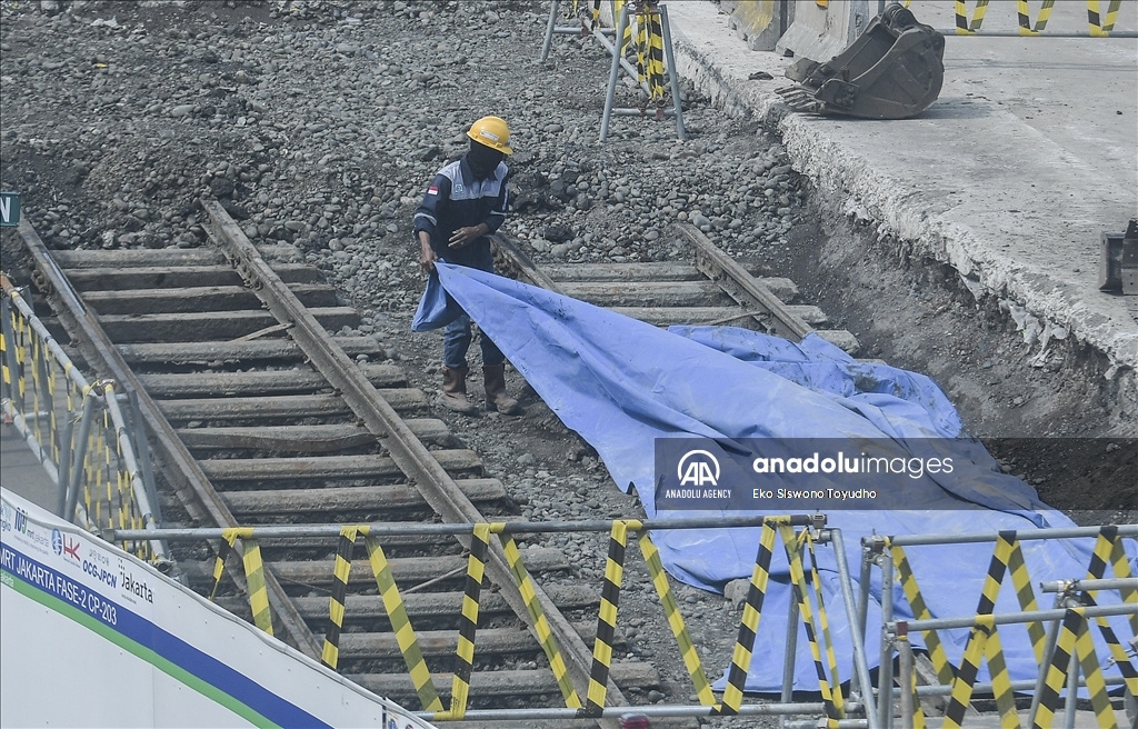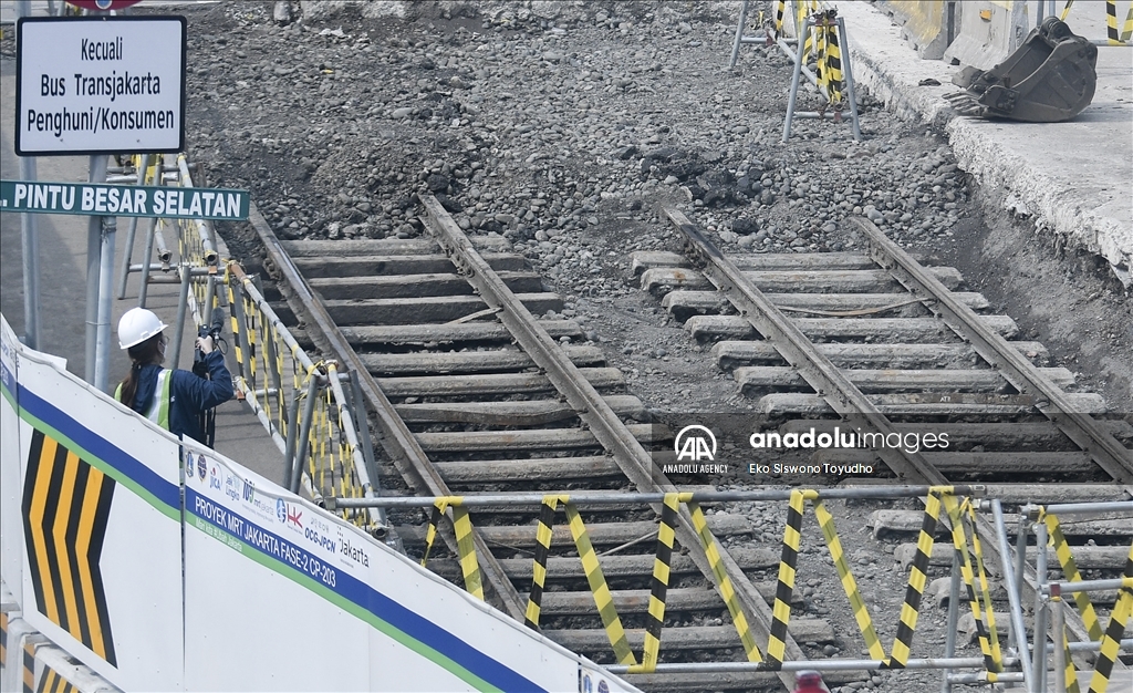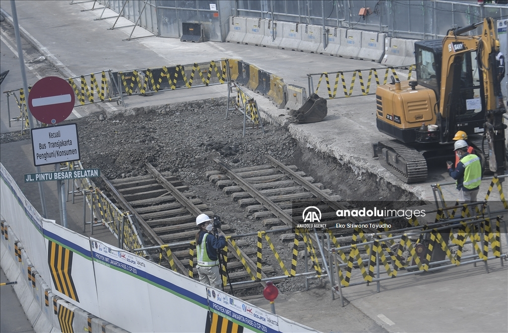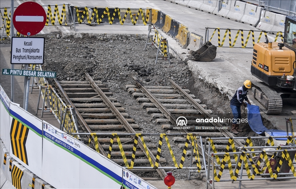 Pekerja menyelesaikan pembangunan Mass Rapid Transit ( MRT ) setelah ditemukannya rel trem tua zaman Belanda di Jakarta, Indonesia pada 29 Desember 2021. Operator mass rapid transit Jakarta, PT MRT Jakarta membenarkan bahwa rel trem lama yang ditemukan saat proyek pembangunan MRT Fase 2 akan dipindahkan dan disimpan. Trem Batavia ditemukan di bawah jalur TransJakarta di Jalan Pintu Besar Selatan Jakarta Barat pada Desember 2021.