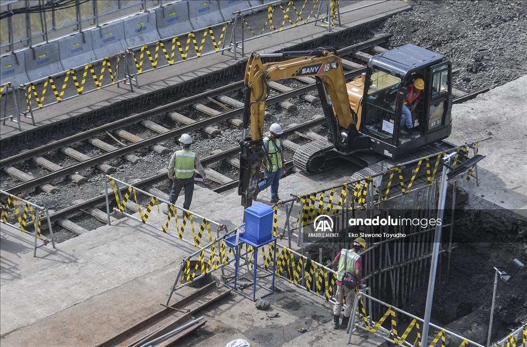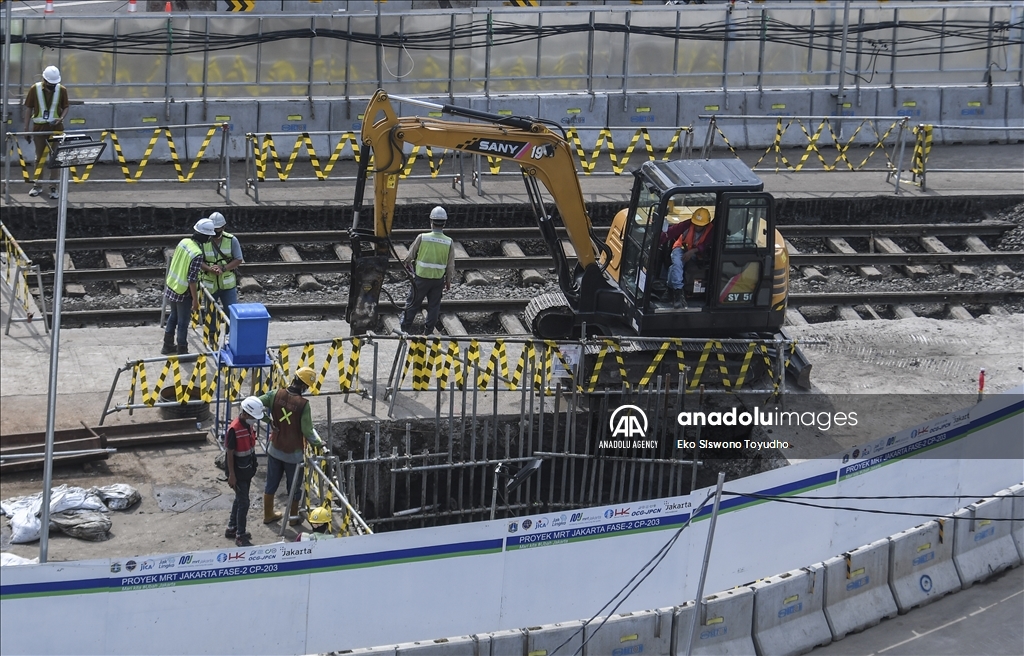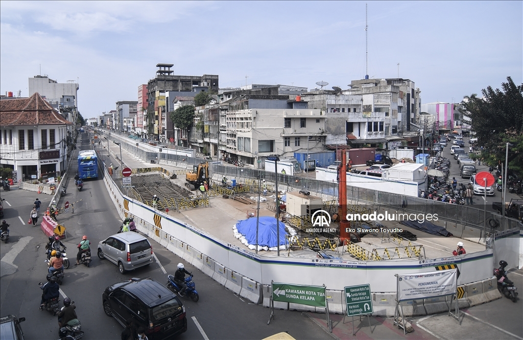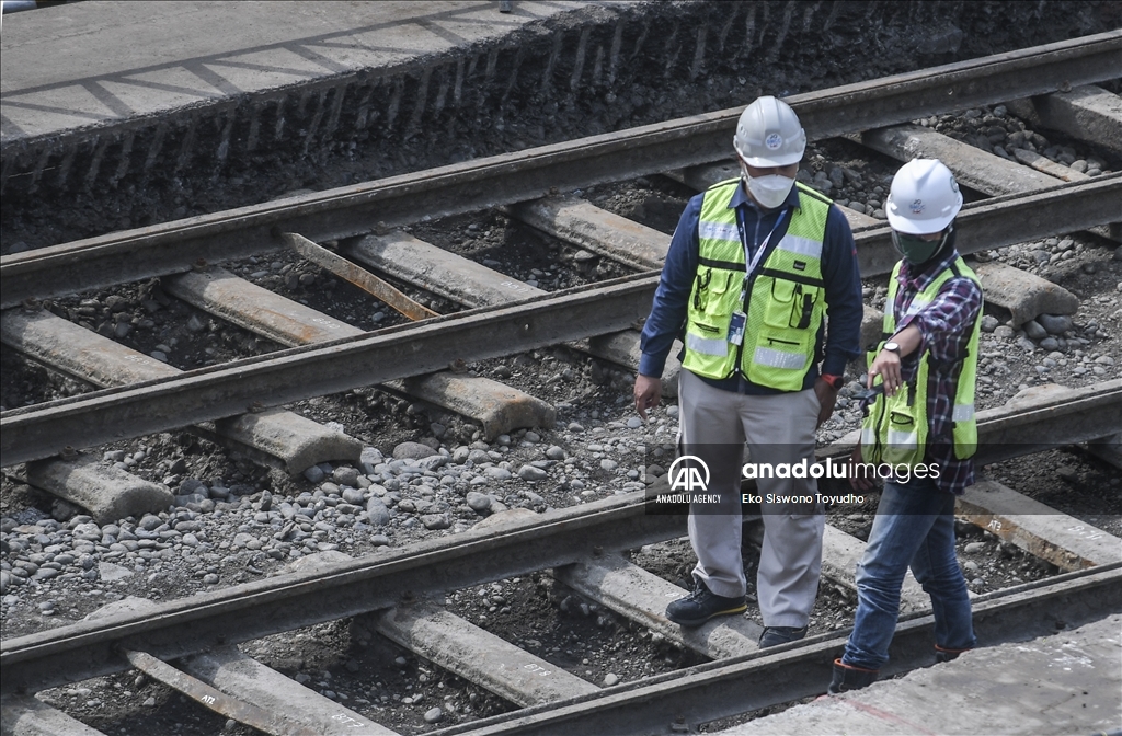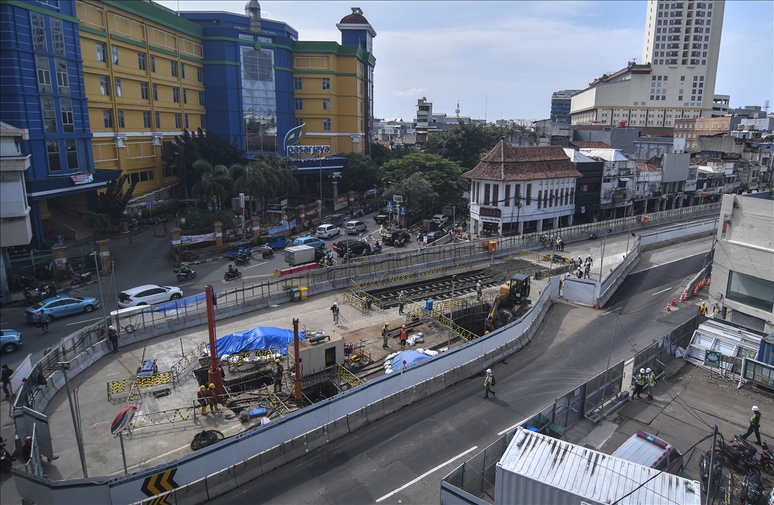 Pekerja menyelesaikan pembangunan Mass Rapid Transit ( MRT ) setelah ditemukannya rel trem tua zaman Belanda di Jakarta, Indonesia pada 29 Desember 2021. Operator mass rapid transit Jakarta, PT MRT Jakarta membenarkan bahwa rel trem lama yang ditemukan saat proyek pembangunan MRT Fase 2 akan dipindahkan dan disimpan. Trem Batavia ditemukan di bawah jalur TransJakarta di Jalan Pintu Besar Selatan Jakarta Barat pada Desember 2021.