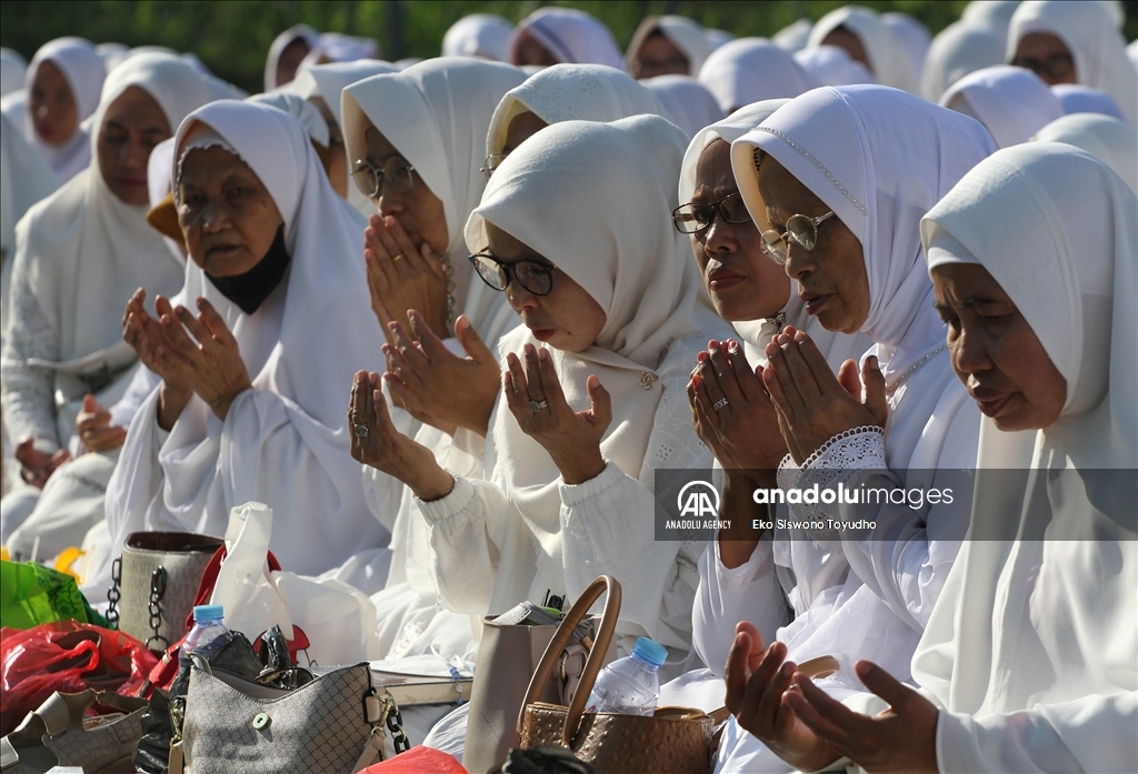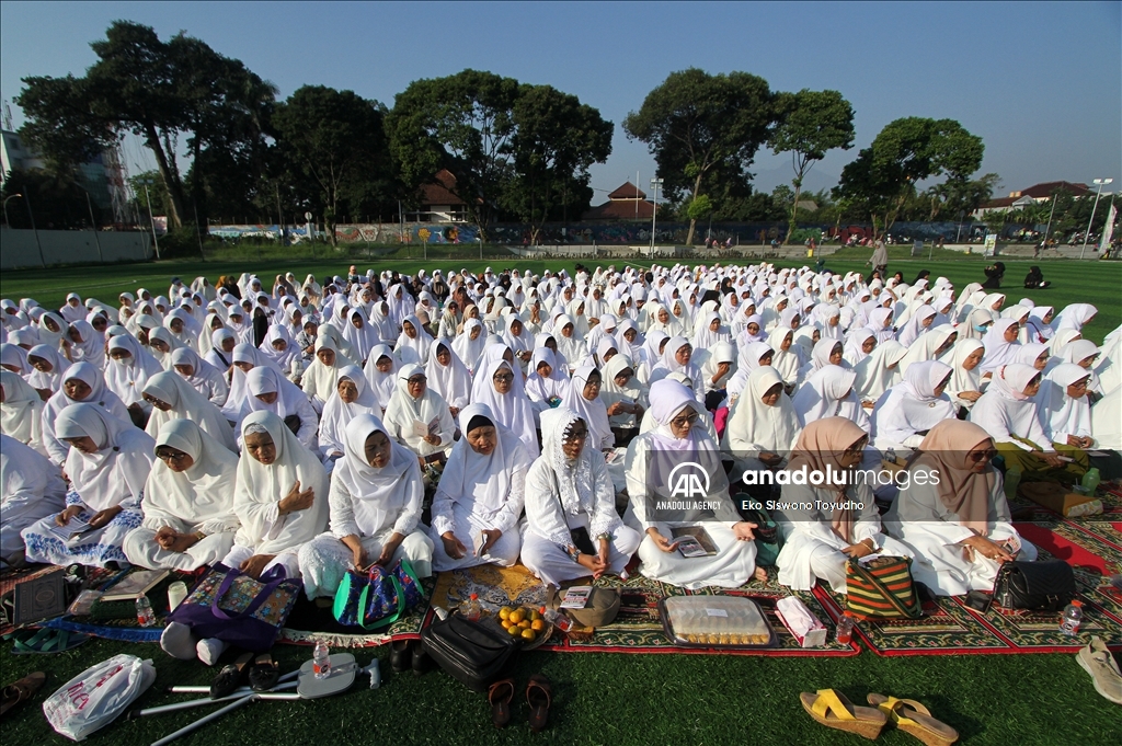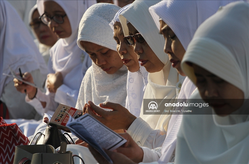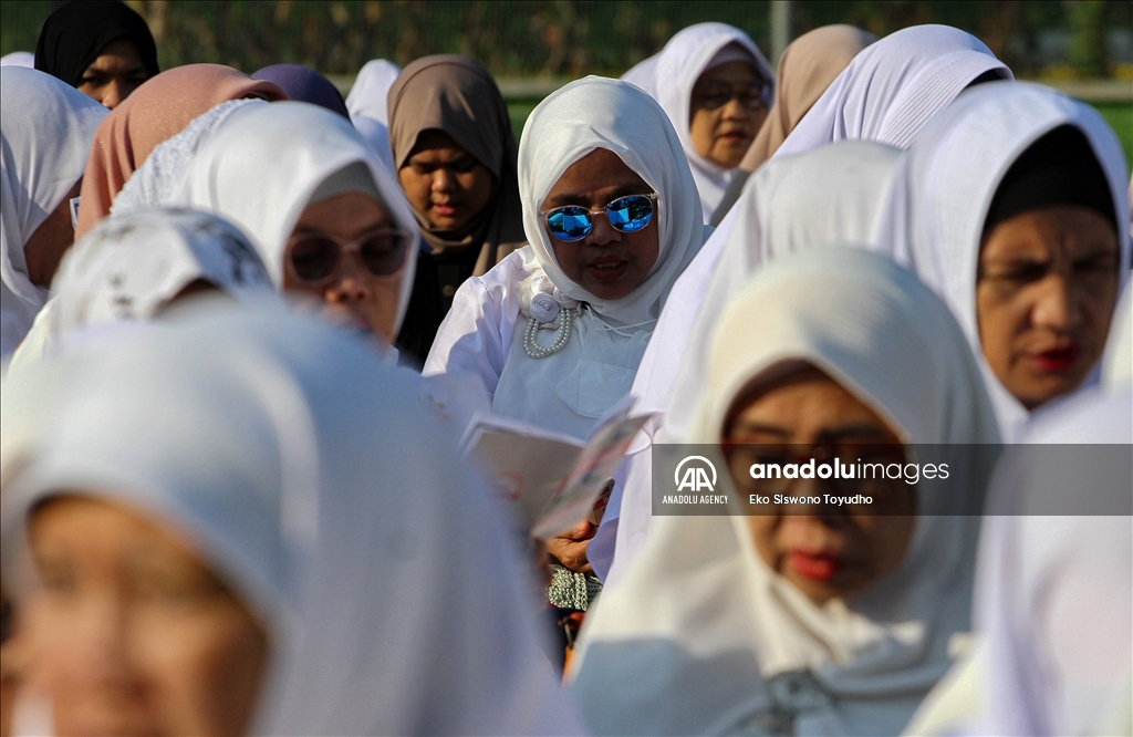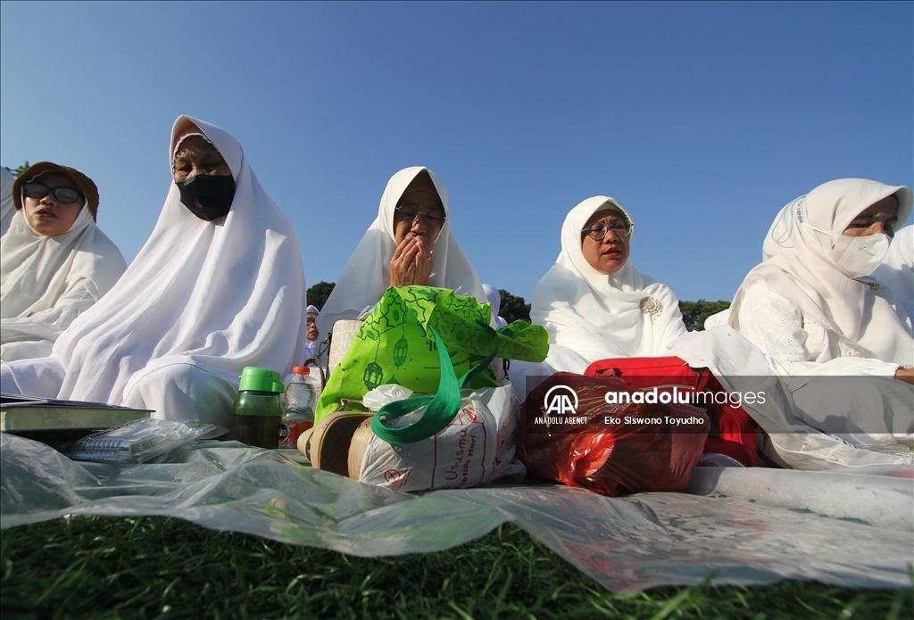 Ribuan warga menghadiri zikir dan doa bersama dilapangan Manunggal, Menteng, Bogor, Jawa Barat, Indonesia pada Rabu 19 Julli, 2023. Doa dan zikir bersama tersebut dilakukan untuk memperingati Tahun Baru Islam 1 Muharram 1445 Hijriah. Eko Siswono Toyudho