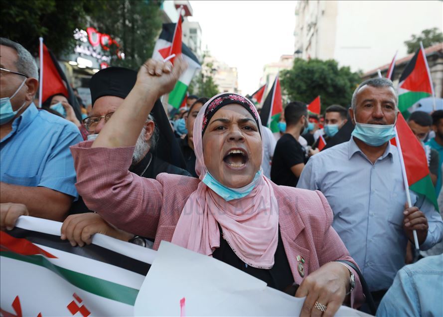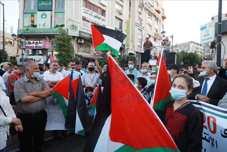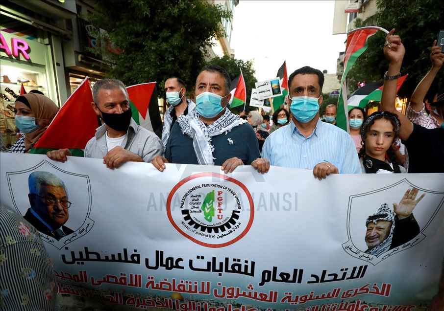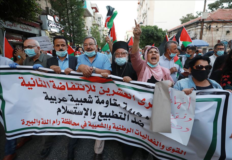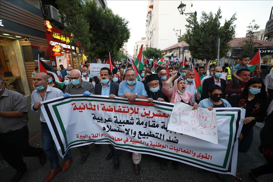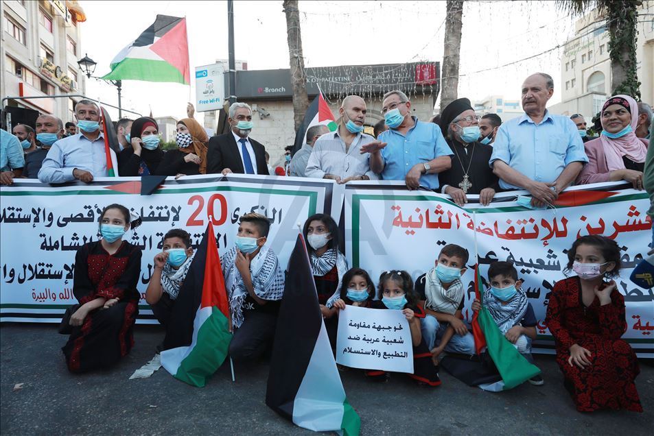 Warga Palestina berdemonstrasi menandai peringatan 20 tahun Intifada Palestina Kedua (Al-Aqsa Intifada) di Lapangan Manara di Ramallah, Tepi Barat pada 28 September 2020. Demonstran memprotes kesepakatan normalisasi dengan Israel, dan menuntut pembebasan tahanan Palestina di penjara Israel. Intifadah Kedua adalah perlawanan rakyat Palestina kedua, melawan Israel antara tahun 2000 dan 2005. Issam Rimawi