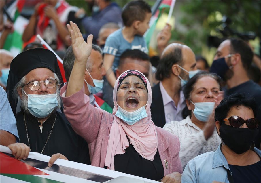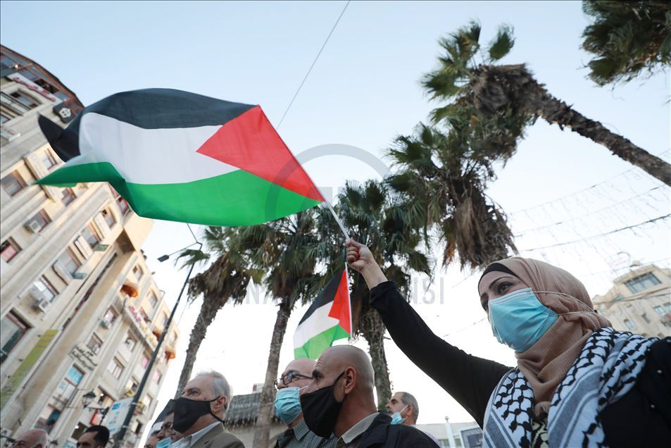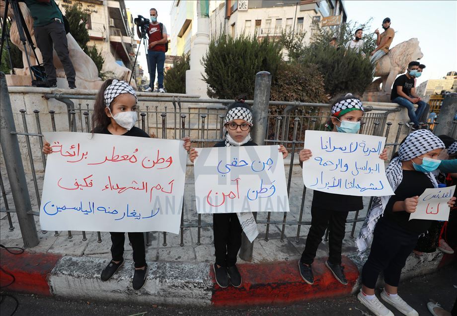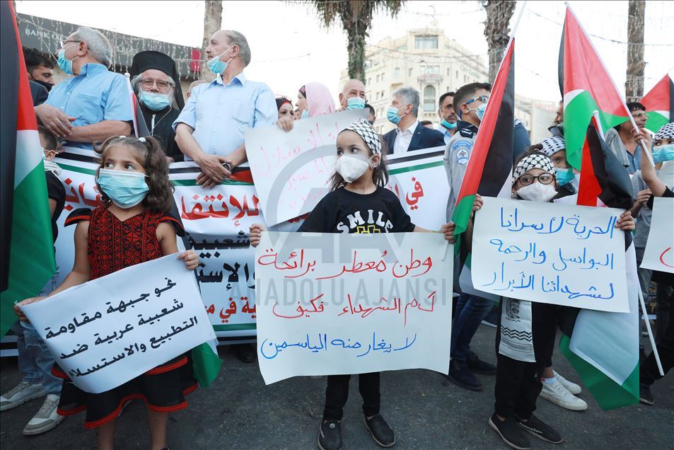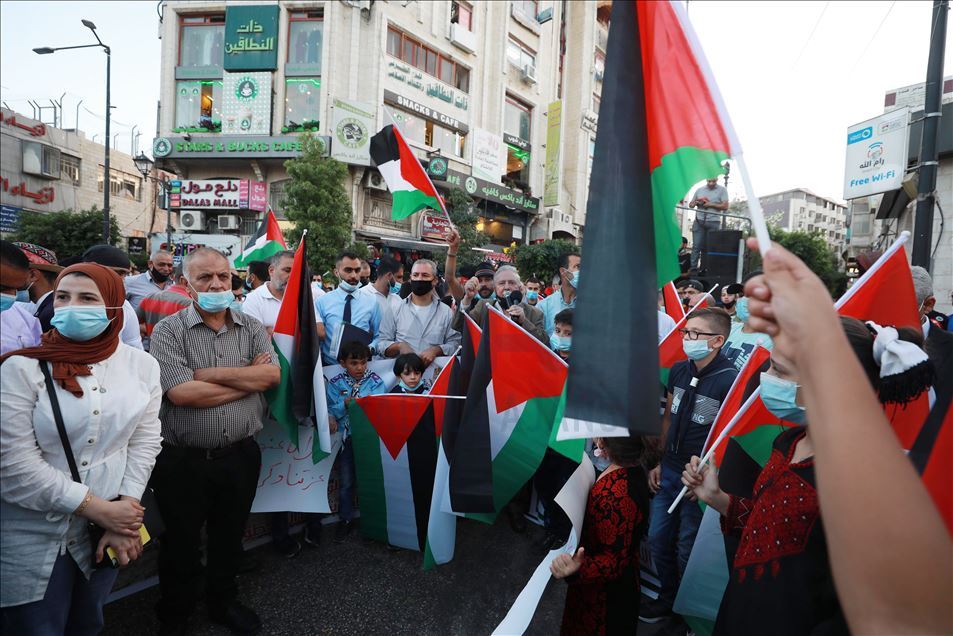 Warga Palestina berdemonstrasi menandai peringatan 20 tahun Intifada Palestina Kedua (Al-Aqsa Intifada) di Lapangan Manara di Ramallah, Tepi Barat pada 28 September 2020. Demonstran memprotes kesepakatan normalisasi dengan Israel, dan menuntut pembebasan tahanan Palestina di penjara Israel. Intifadah Kedua adalah perlawanan rakyat Palestina kedua, melawan Israel antara tahun 2000 dan 2005. Issam Rimawi