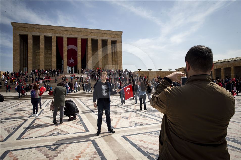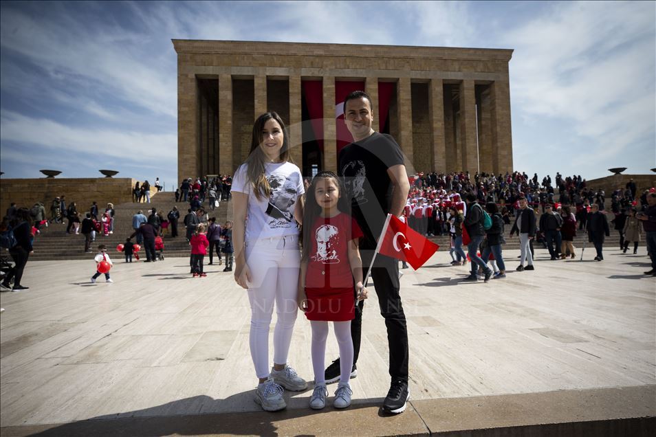 Warga berpose saat mereka mengunjungi Anitkabir makam Mustafa Kemal Ataturk pendiri Republik Turki saat peringatan Hari Anak dan Kedaulatan Nasional Turki di Ankara, Turki pada 23 April 2019. Peringatan 23 April fokus pada anak-anak setelah Ataturk menjadi ketua parlemen pertama, mendedikasikan hari untuk anak-anak sebagai masa depan bangsa.