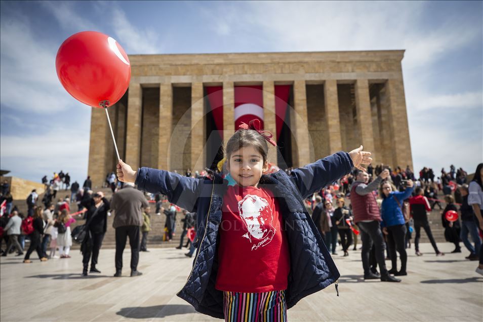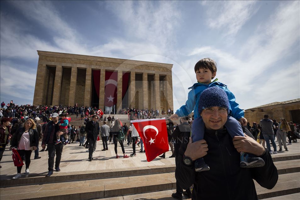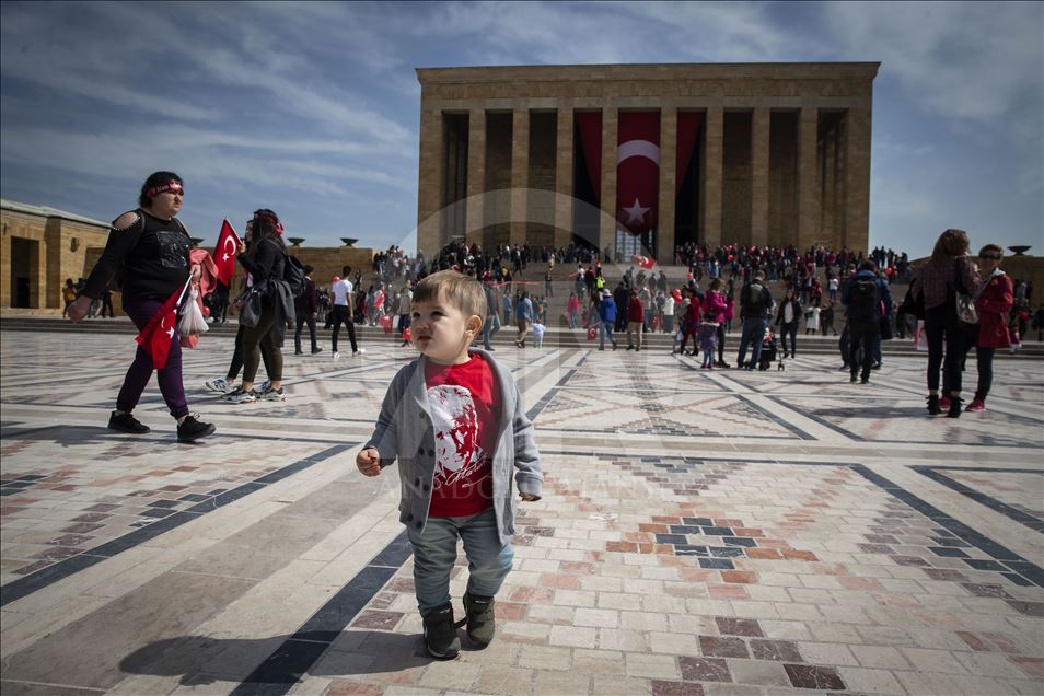 Warga mengunjungi Anitkabir makam Mustafa Kemal Ataturk pendiri Republik Turki saat peringatan Hari Anak dan Kedaulatan Nasional Turki di Ankara, Turki pada 23 April 2019. Peringatan 23 April fokus pada anak-anak setelah Ataturk menjadi ketua parlemen pertama, mendedikasikan hari untuk anak-anak sebagai masa depan bangsa.