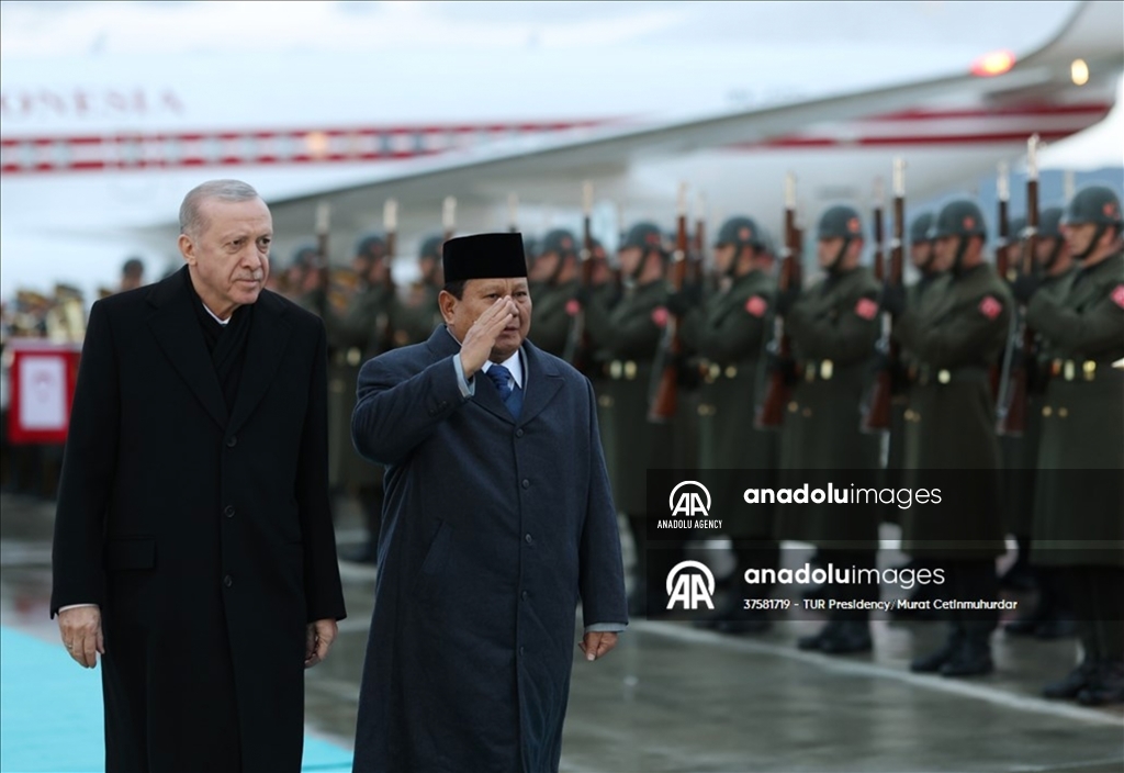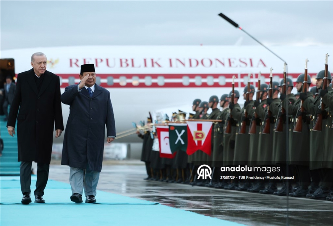 Presiden Turkiye Recep Tayyip Erdogan (kiri) mendampingi Presiden Indoensia Prabowo Subiyanto (kedua kiri) saat membeikan hormat kepada Pasukan Kehormatan setibanya di Bandara Essenboga, Ankara, Turkiye pada 9 April 2025Sekretariat Presiden Turkiye