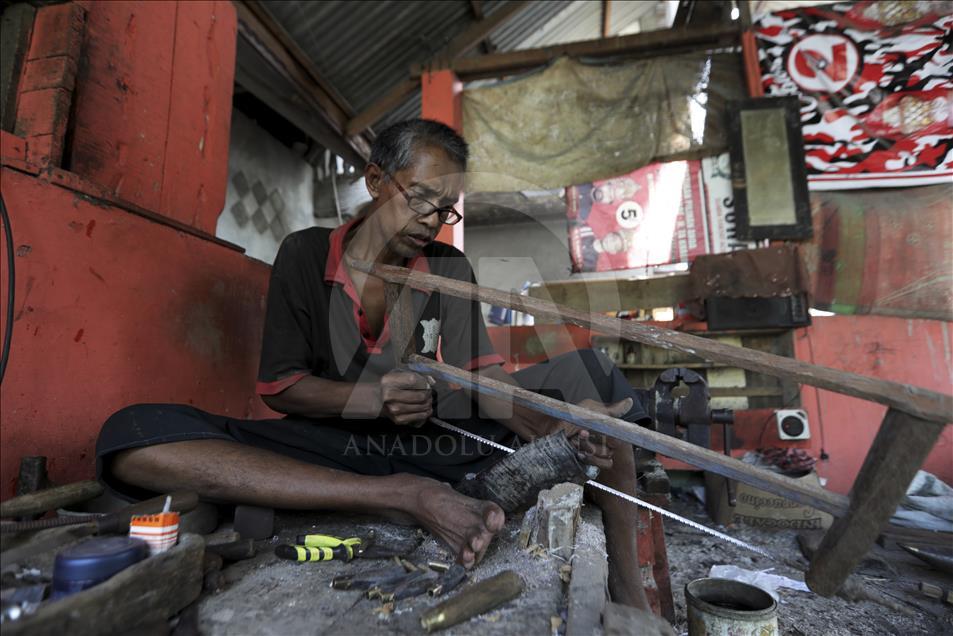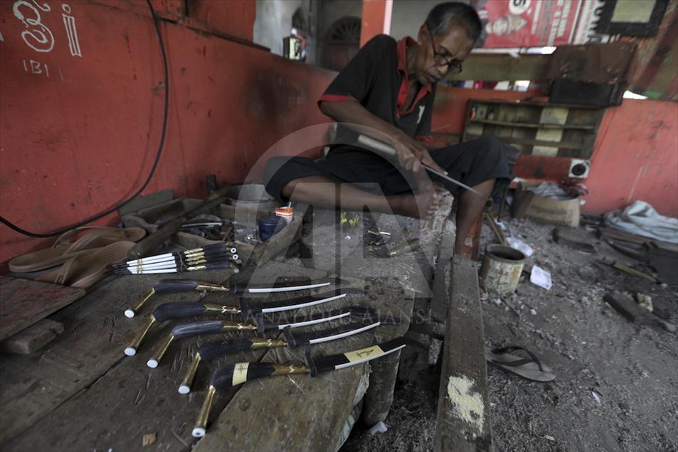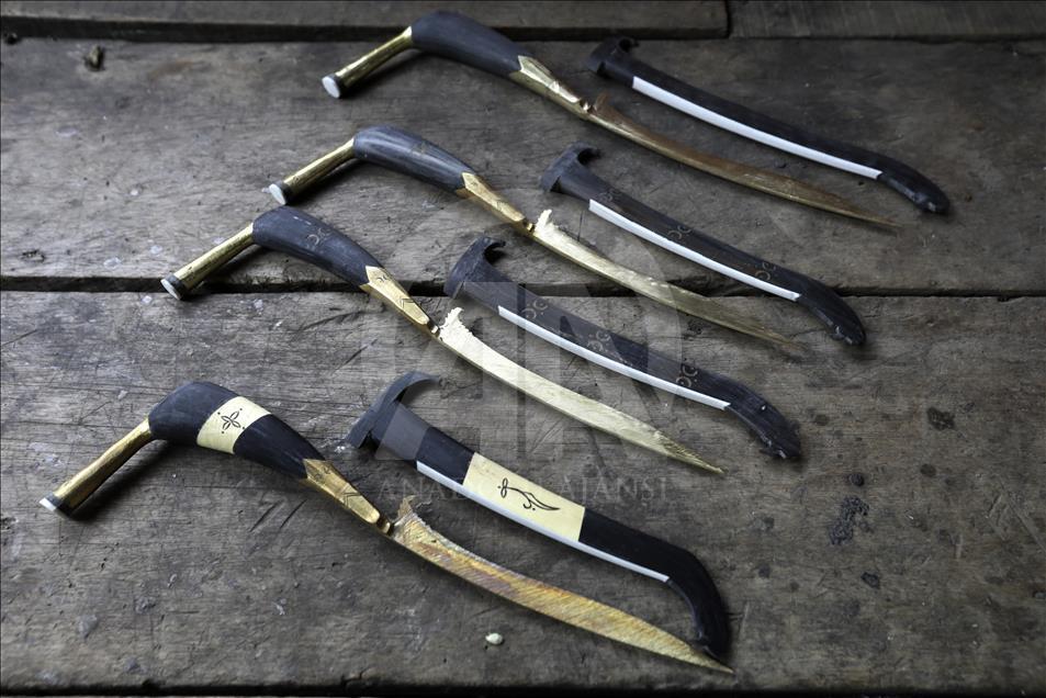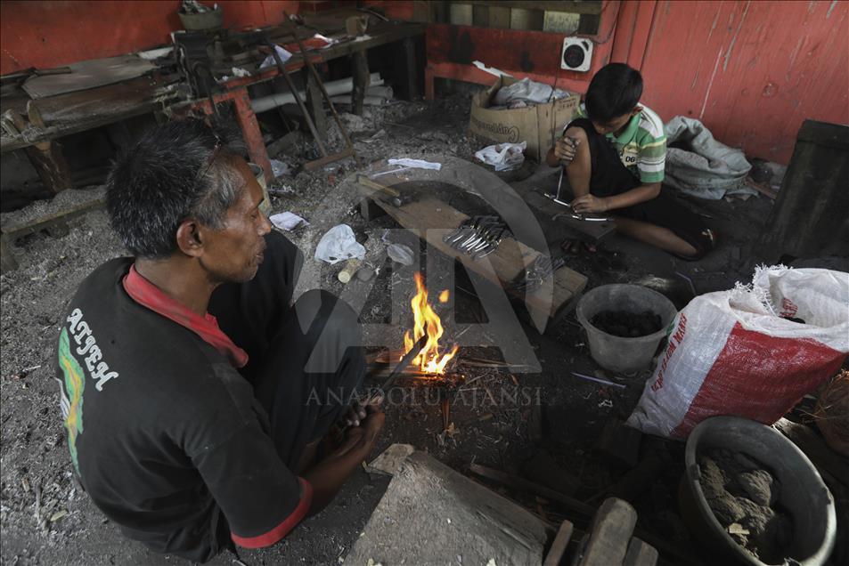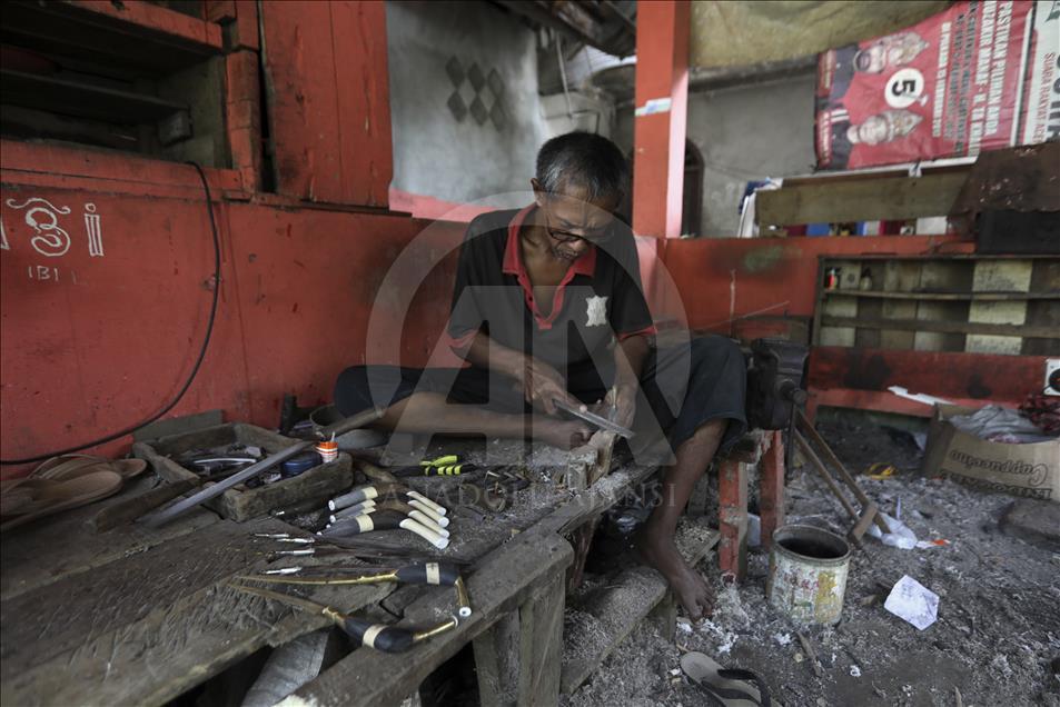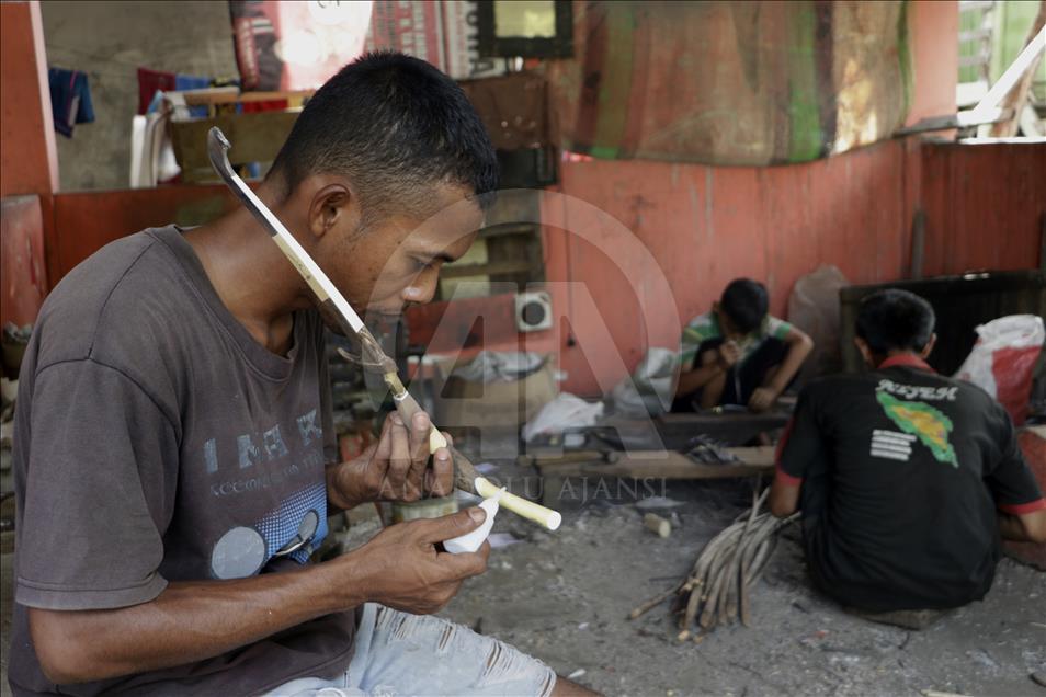 Pengrajin membuat Rencong di Desa Baet Lampuot, Kabupaten Aceh Besar, Provinsi Aceh pada 06 Januari 2018. Rencong merupakan salah satu senjata tradisional Aceh dan saat ini berubah peran menjadi suvenir.