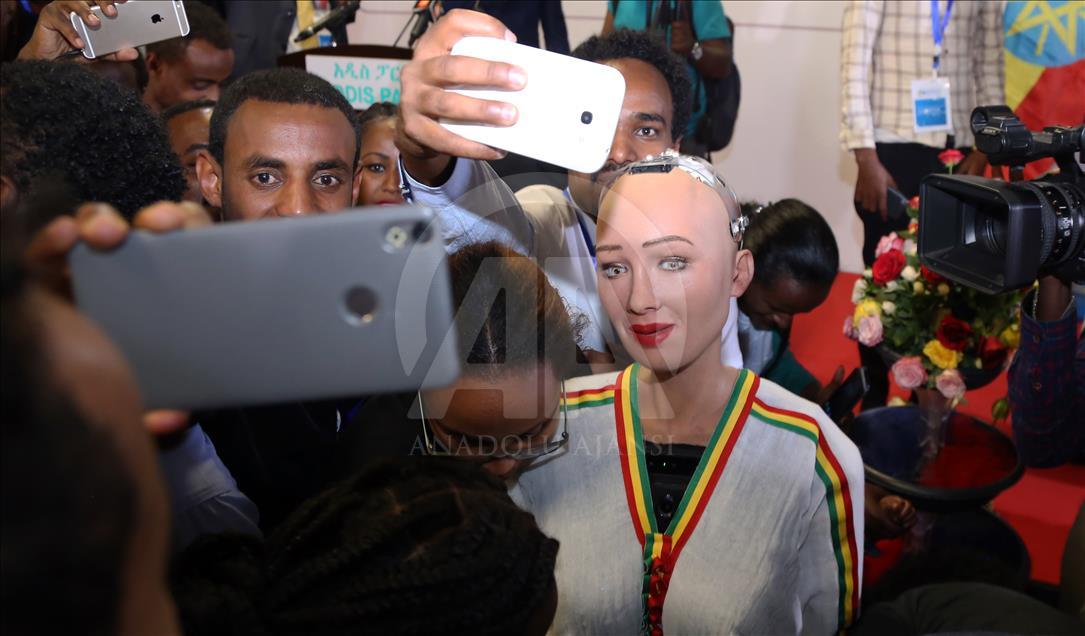 Robot Humanoid Sophia terlihat saat upacara pembukaan "ICT Expo Ethiopia" di Addis Ababa, Ethiopia pada 30 Juni 2018. Sophia, telah diprogram untuk berbicara Amharic, bahasa resmi Ethiopia, sebelum kunjungan.Minasse Wondimu Hailu