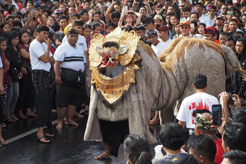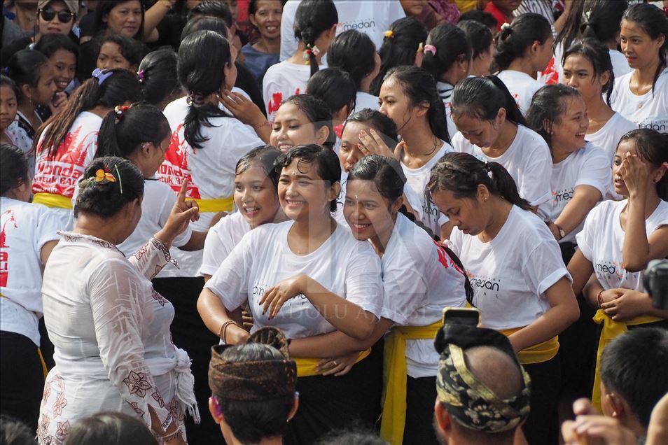 Sejumlah warga menghadiri tradisi Omed-omedan di desa Sesetan, Bali, Indonesia pada 8 Maret 2019. Omed-omedan adalah ritual saling peluk dan tarik-menarik secara bergantian antara dua kelompok muda-mudi yang belum menikah dan rutin diadakan setiap tahun pada hari pertama setelah Nyepi.Mahendra Moonstar