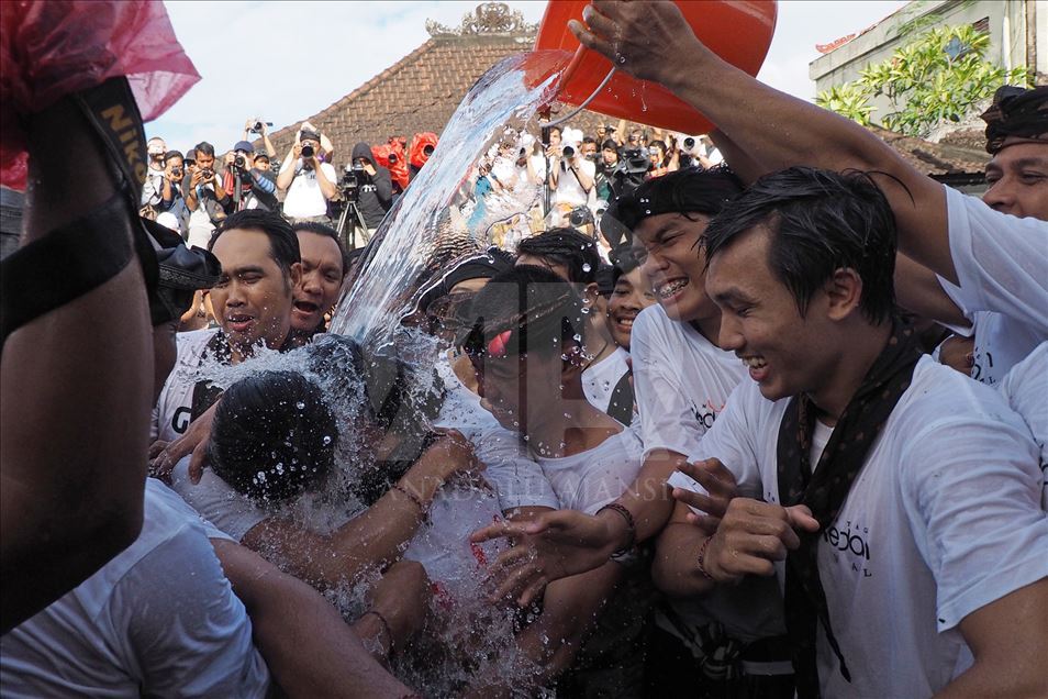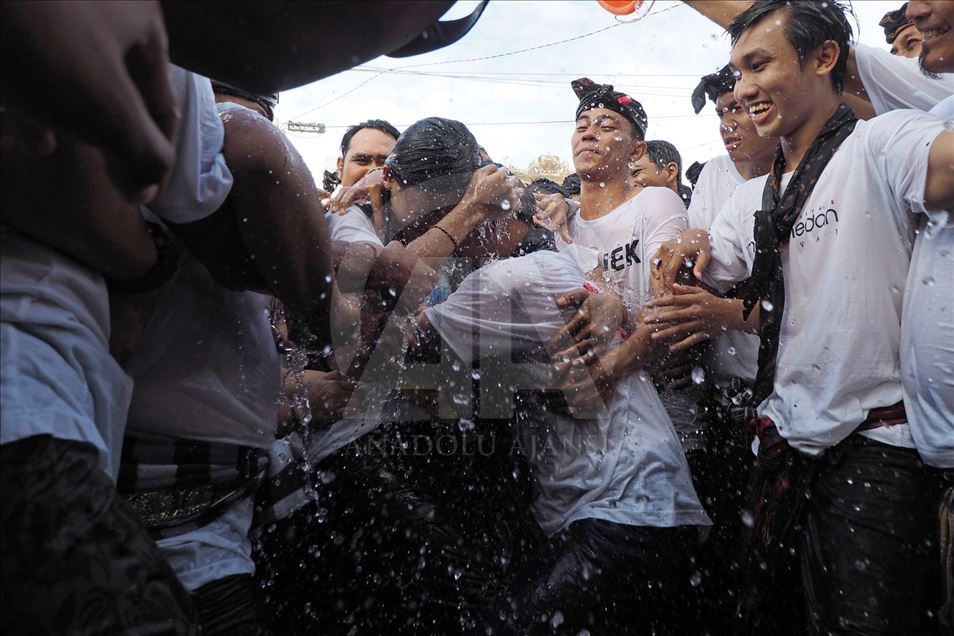 Sejumlah pemuda terlihat saat menghadiri tradisi Omed-omedan di desa Sesetan, Bali, Indonesia pada 8 Maret 2019. Omed-omedan adalah ritual saling peluk dan tarik-menarik secara bergantian antara dua kelompok muda-mudi yang belum menikah dan rutin diadakan setiap tahun pada hari pertama setelah Nyepi.Mahendra Moonstar