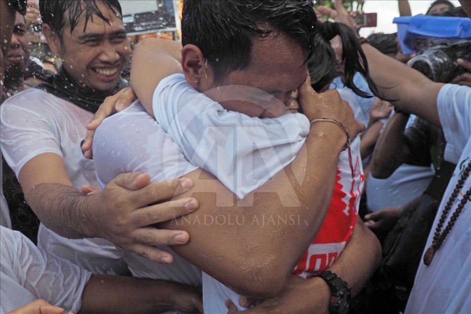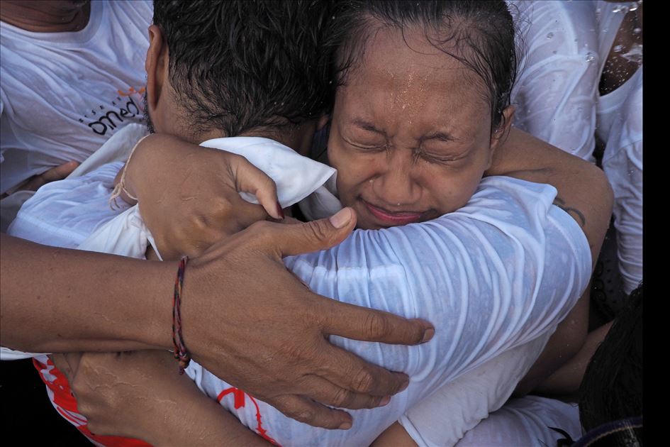 Sejumlah muda-mudi saling berpelukan saat mengikuti tradisi Omed-omedan di desa Sesetan, Bali, Indonesia pada 8 Maret 2019. Omed-omedan adalah ritual saling peluk dan tarik-menarik secara bergantian antara dua kelompok muda-mudi yang belum menikah dan rutin diadakan setiap tahun pada hari pertama setelah Nyepi.Mahendra Moonstar