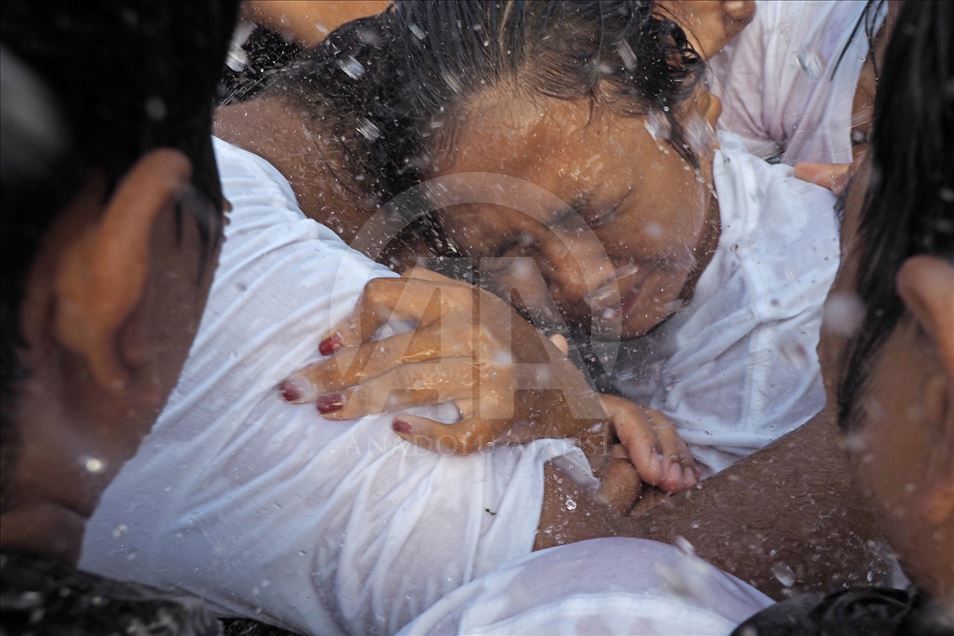Sejumlah pemudi terlihat saat menghadiri tradisi Omed-omedan di desa Sesetan, Bali, Indonesia pada 8 Maret 2019. Omed-omedan adalah ritual saling peluk dan tarik-menarik secara bergantian antara dua kelompok muda-mudi yang belum menikah dan rutin diadakan setiap tahun pada hari pertama setelah Nyepi.Mahendra Moonstar