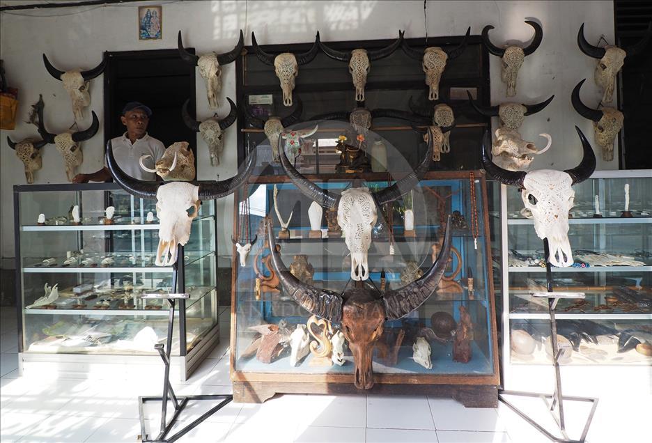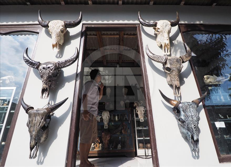 Ukiran seni dari kepala kerbau hasil karya dari I Gede Parna di tampilkan di toko souvenir di Gianyar Bali, Indonesia pada 23 Mei 2018. Harga ukiran kepala kerbau ini dijual bervariasi untuk ukuran kepala kerbau yang besar dan tanduk panjang dijual hingga 1,5 juta rupiah.