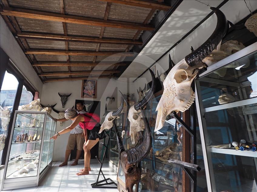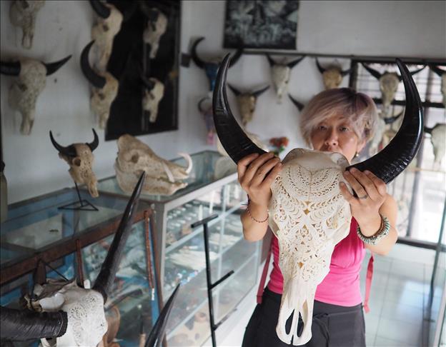 Seorang turis asal jepang sedang melihat ukiran seni kepala kerbau yang ditampilkan di sebuah toko souvenir di Bali, Indonesia pada 23 Mei 2018. Harga ukiran kepala kerbau ini dijual bervariasi untuk ukuran kepala kerbau yang besar dan tanduk panjang dijual hingga 1,5 juta rupiah.