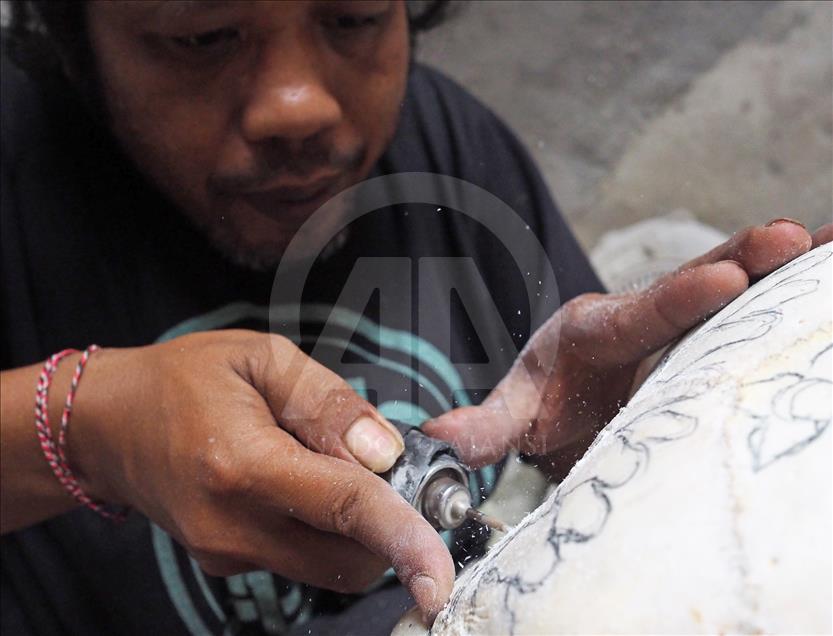 I Gede Parna (41) sedang membuat ukiran seni dengan bahan baku dari kepala kerbau, di Bali, Indonesia pada 23 Mei 2018. Pekerjaan mengukir kepala kerbau telah ditekuninya sejak puluhan tahun lalu, dan kini hasil karya banyak diminati turis mancanegara.