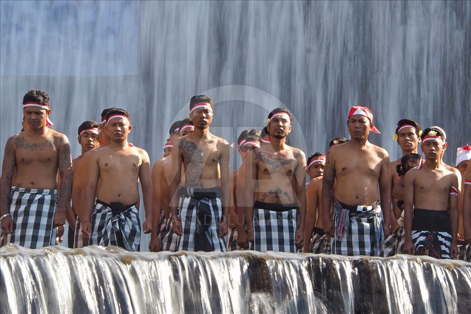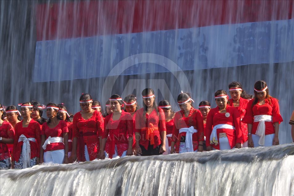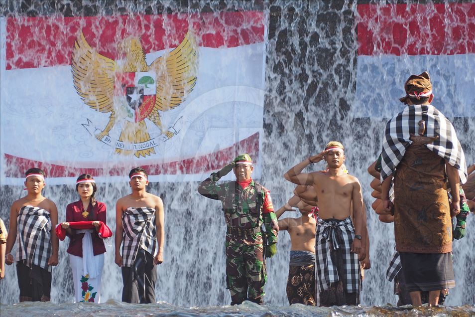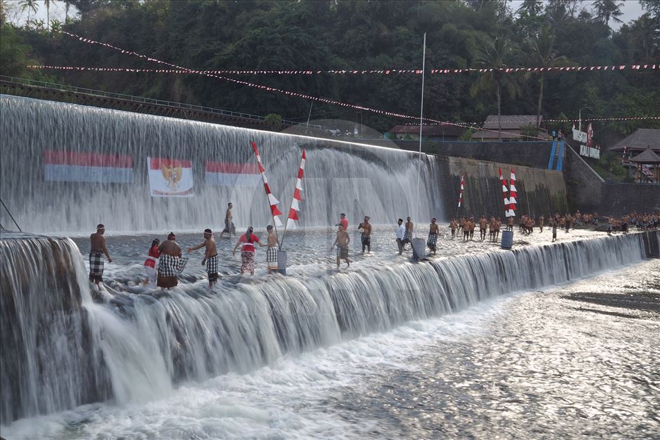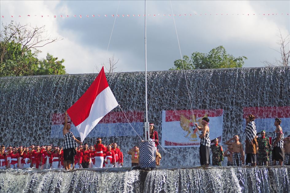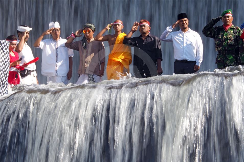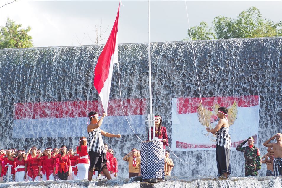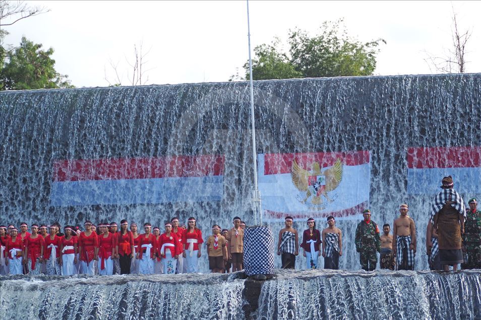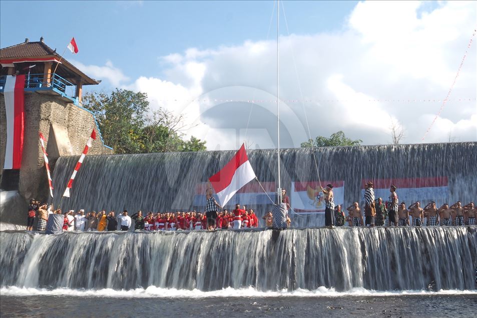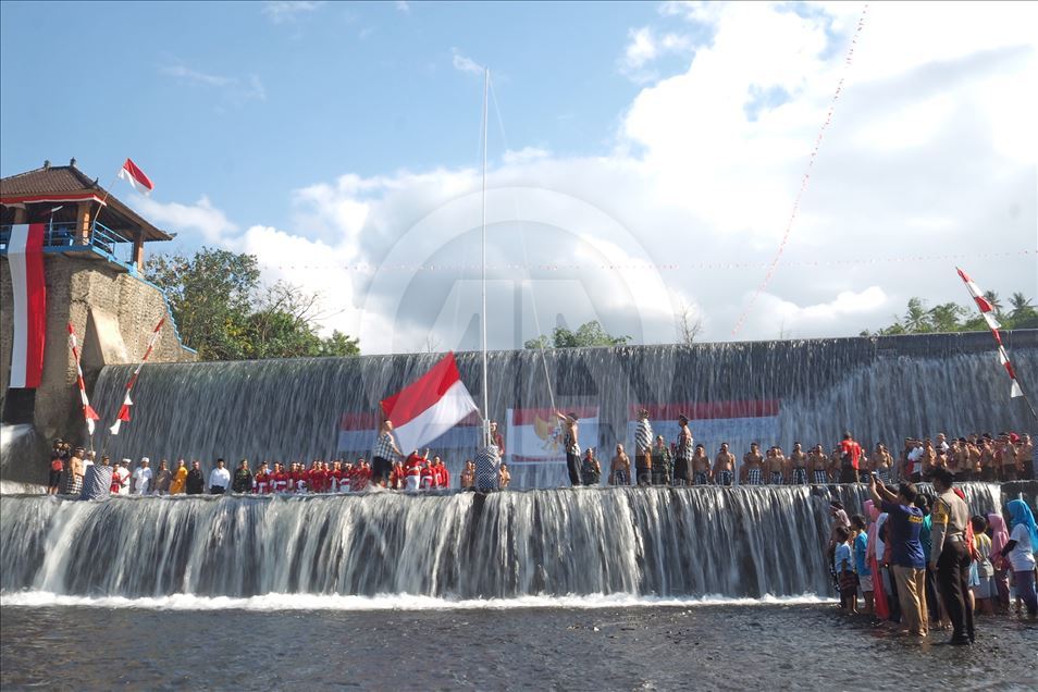 BALI, INDONESIA - 17 AGUSTUS: Warga Kelurahan Semarapura Kangin menggelar upacara bendera di Tukad (Sungai) Unda, Klungkung, untuk memperingati HUT Kemerdekaan RI ke-74 di Kabupaten Klungkung, Bali, Indonesia pada 17 Agustus 2019. ( Mahendra Moonstar - Anadolu Agency )Mahendra Moonstar