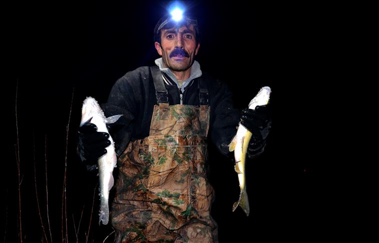 Li Sarîqamişa navçeya Qersê gundiyên ku li Karakurtê dijîn şev di çemê Erezê de masiyan digrin.