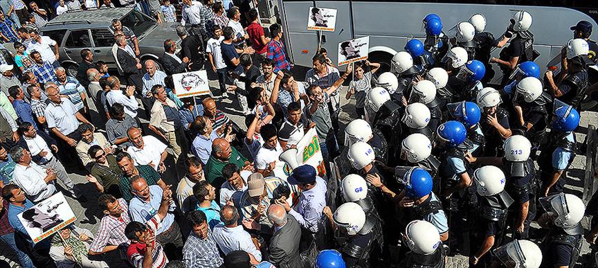Koma ku gihişt navende sûkê dest bi dirûşmeyan kir, ji ber vê yekê di navbera polês û xwepêşandêran de ragêşî çêbû.