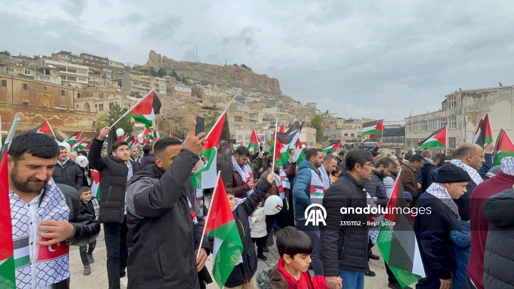 Komê pankartên ku li ser wan bi Tirkî, Kurdî û Erebî "Ji Mêrdînê hezar silav ji berxwedana Xezeyê re" nivîsandî hildan û li dijî Îsraîlê diruşm xwendin.