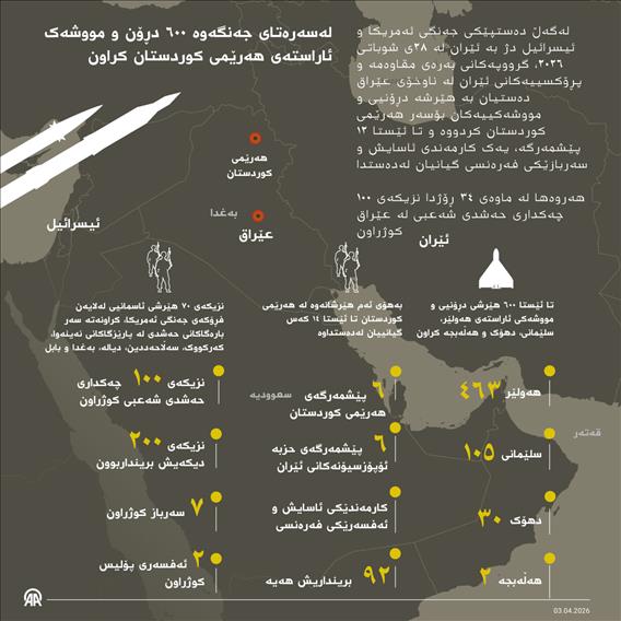 لەسەرەتای جەنگەوە ٦٠٠ دڕۆن و مووشەک ئاراستەی ھەرێمی کوردستان کراون