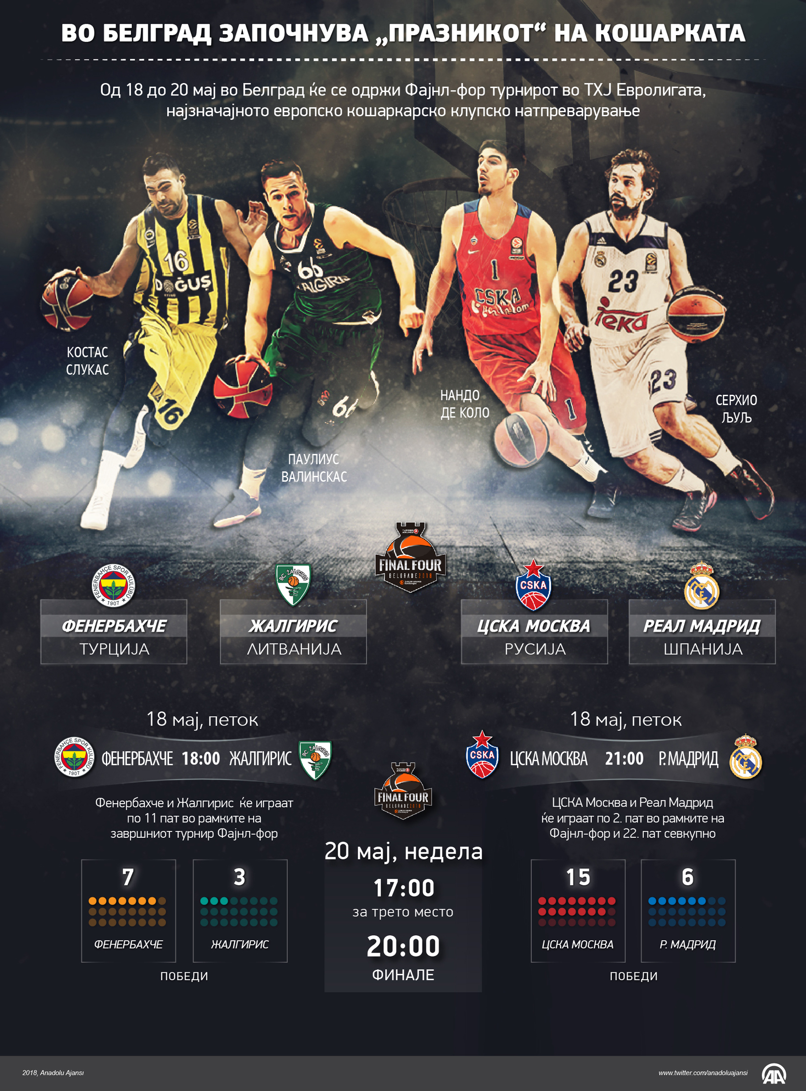 Од 18 до 20 мај во Белград ќе се одржи Фајнл-фор турнирот во ТХЈ Евролигата, најзначајното европско кошаркарско клупско натпреварување. На турнирот во Белград учествуваат екипите на Фенербахче Догуш (Турција), Реал Мадрид (Шпанија), Жалгирис (Литванија) и ЦСКА Москва (Русија).17 Мај 2018•Ажурирај: 17 Мај 2018