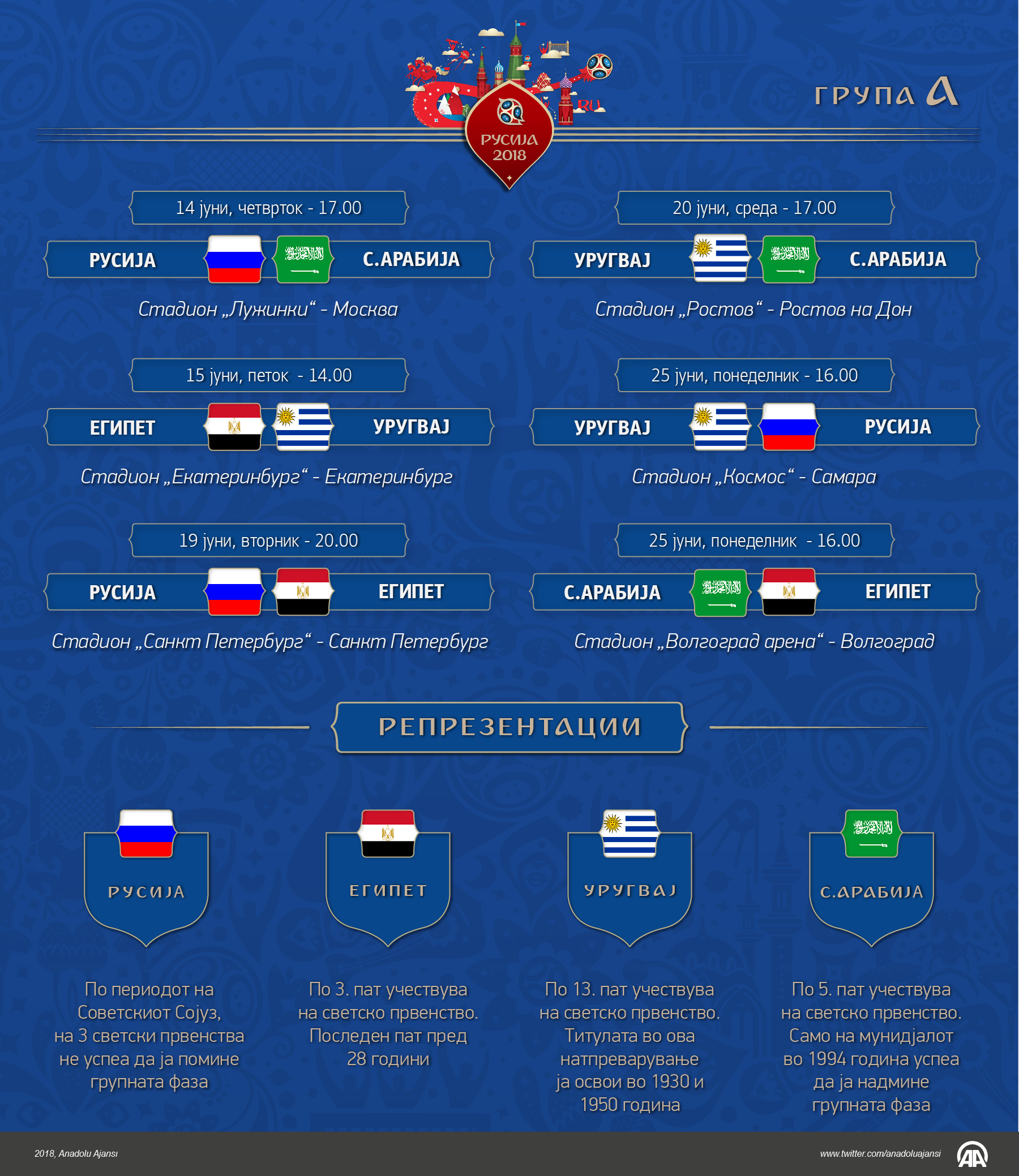 На светското фудбалско првенство ФИФА 2018 што се одржува во Русија, во групата А, за пласман во наредната фаза ќе се натпреваруваат репрезентациите на домаќинот Русија, Египет, Уругвај и Саудиска Арабија