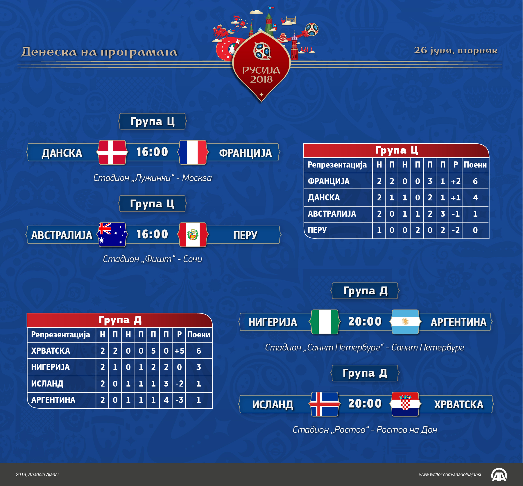 Денеска, 26 јуни, вторник, на програмата се последните 4 натпревари од групите Ц и Д. Во група Ц се среќаваат Австралија - Перу и Данска - Франција, додека во групата Д се среќаваат Нигерија - Аргентина и Исланд - Хрватска
