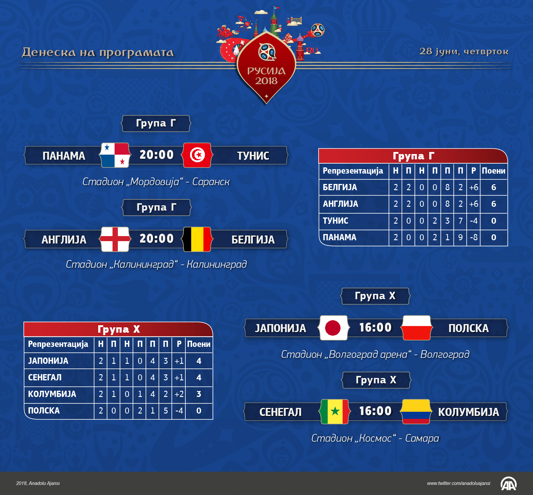 Денеска, 28 јуни, четврток, ќе се одиграат натпреварите од групите Г и Х. Во групата Х се среќаваат Јапонија - Полска и Сенегал - Колумбија, а во групата Г играат Панама - Тунис и Англија - Белгија28 Јуни 2018•Ажурирај: 28 Јуни 2018