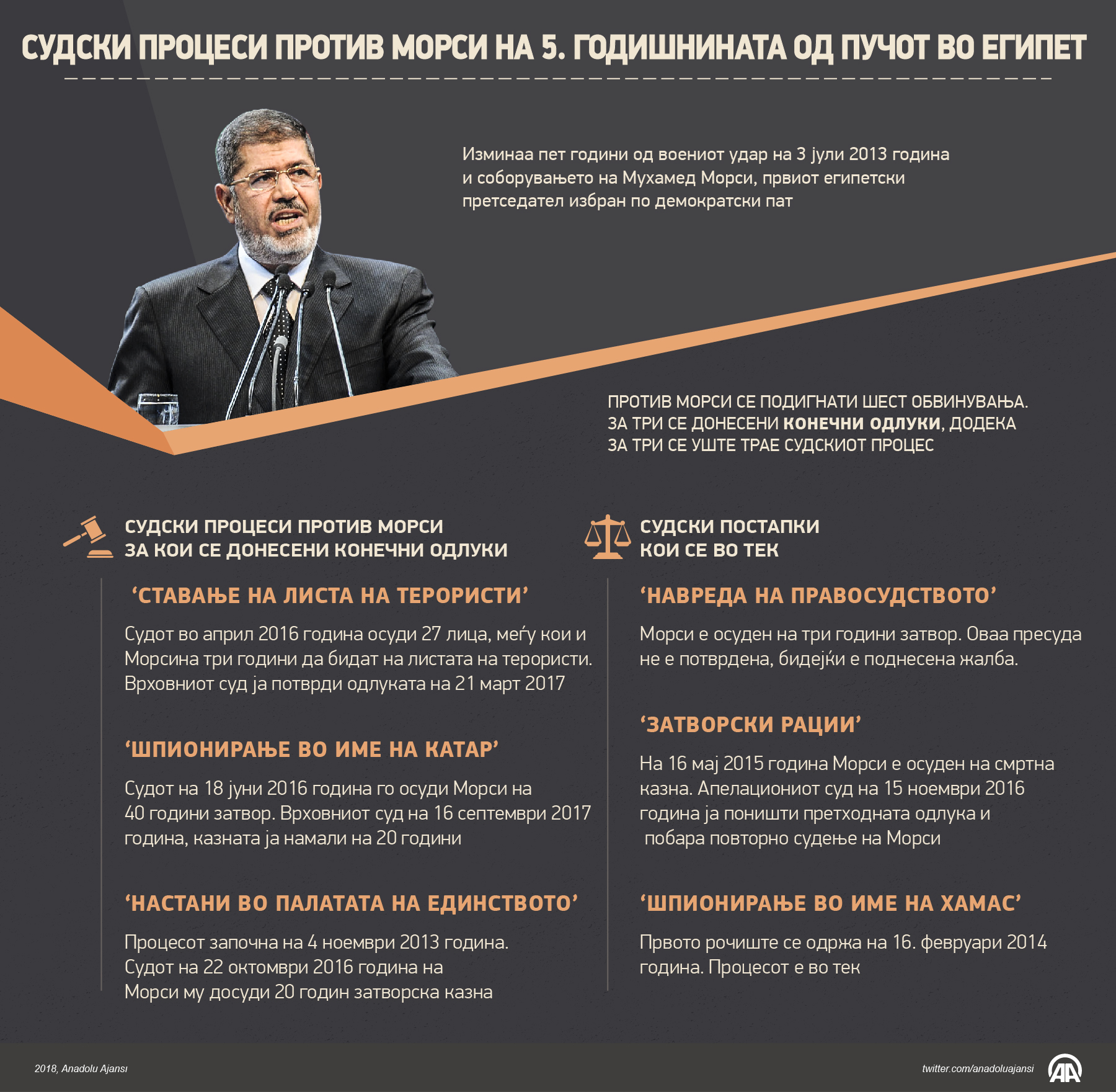 КАИРО (АА) - Изминаа пет години од воениот удар на 3 јули 2013 година и соборувањето на Мухамед Морси, првиот египетски претседател избран по демократски пат, јавува Anadolu Agency (AA).03 Јули 2018•Ажурирај: 03 Јули 2018