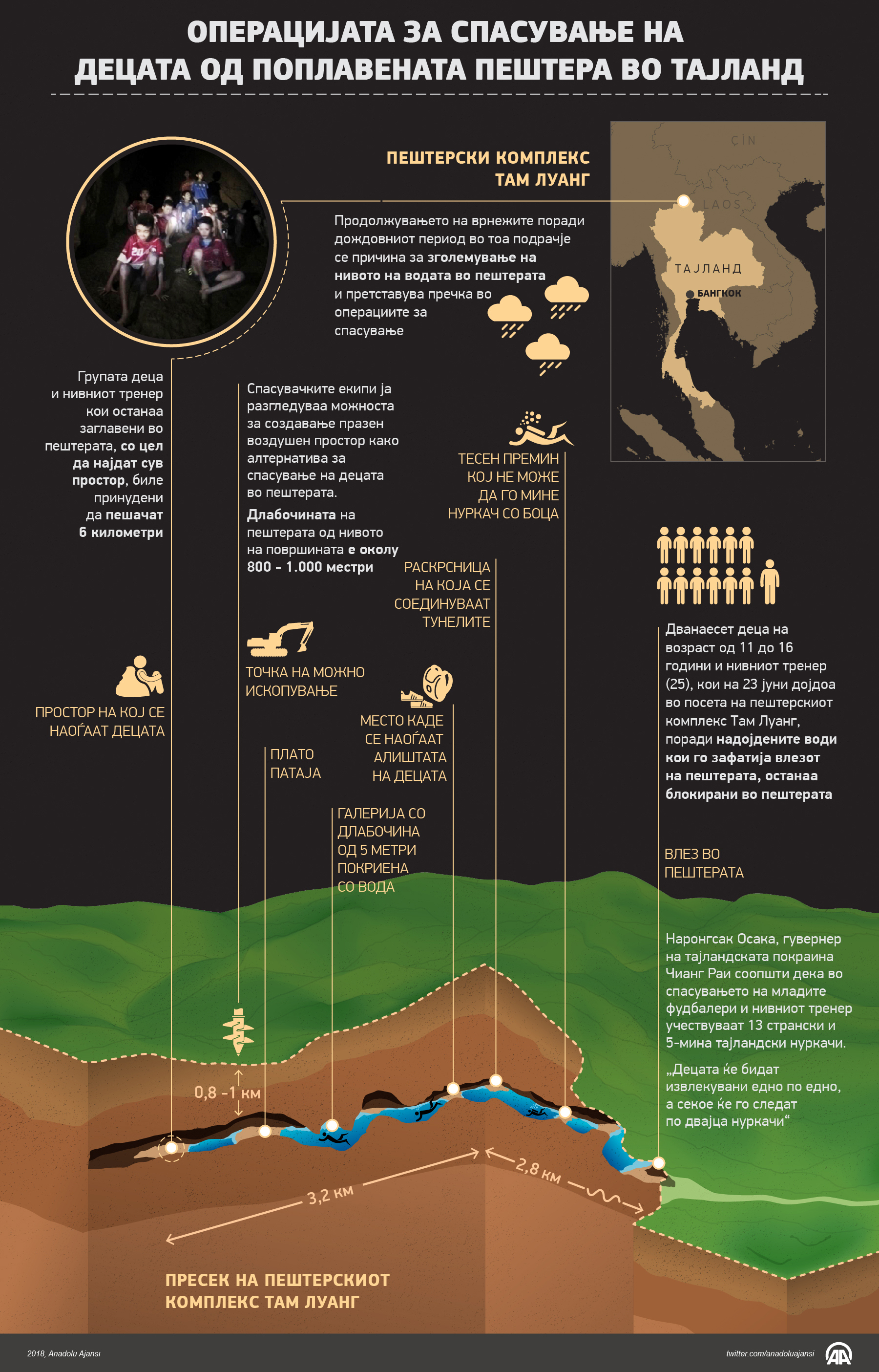 Рано утринава започна операцијата за евакуација на 12 момчиња на возраст од 11 до 16 години и на нивниот 25-годишен тренер кои со денови останаа блокирани во пештерскиот комплекс Там Луанг во северен Тајланд, откако поплавите го блокираа влезот во пештерата. Наронгсак Осака, гувернерот на тајландската покраина Чианг Раи, соопшти дека во операцијата за спасување на младите фудбалери и нивниот тренер учествуваат 13 странски и 5-мина тајландски нуркачи.08 Јули 2018•Ажурирај: 08 Јули 2018