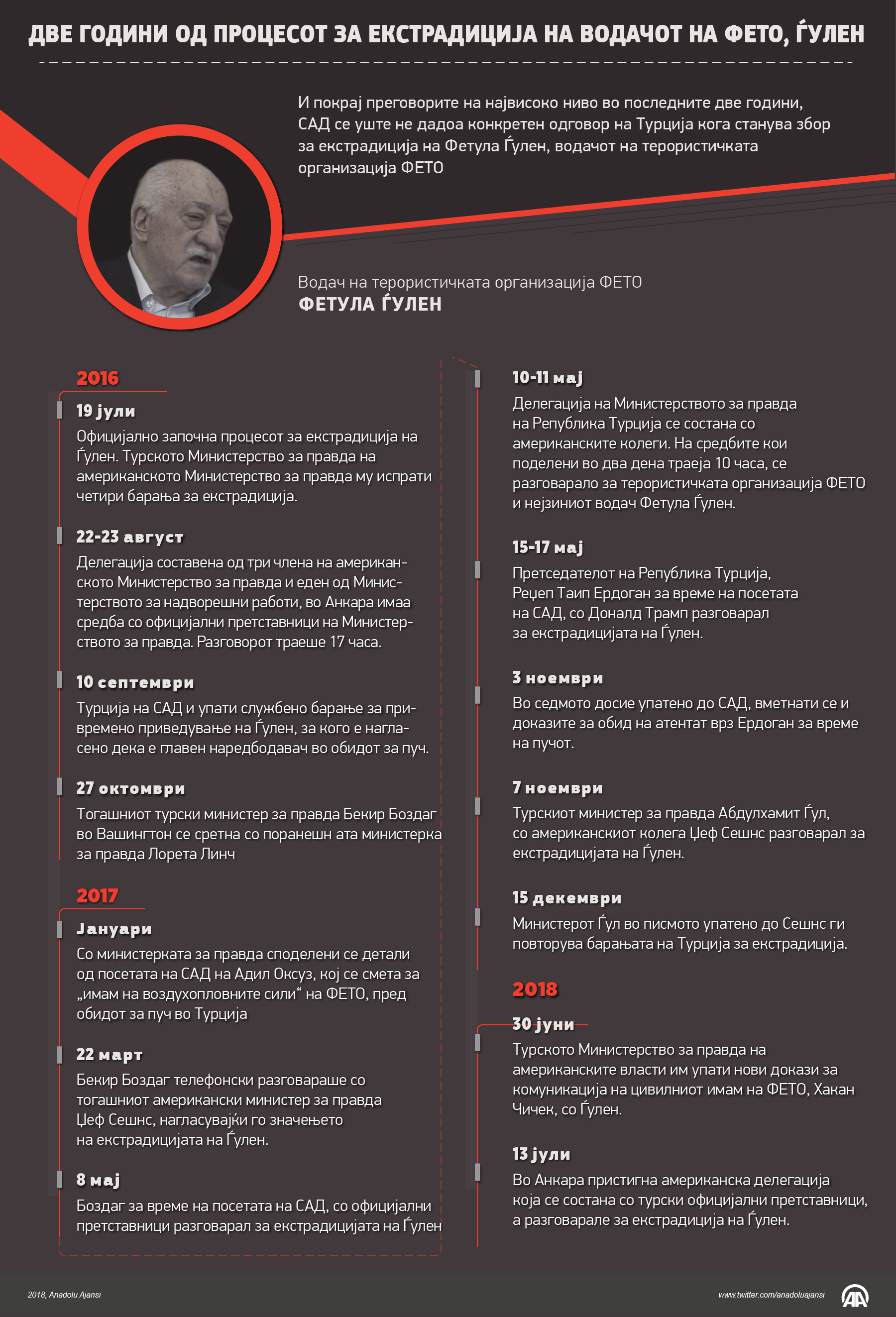 Пред повеќе од две години, поточно на 15 јули 2016 година, членовите на терористичката организација ФЕТО, предводени од Фетула Ѓулен, се обидоа да извршат пуч во Турција. Само четири дена потоа, Турција испрати барање до САД да го екстрадира Ѓулен, лидерот на ФЕТО, но Турција сé уште не доби конкретен одговор од САД во врска со екстрадицијата на Ѓулен19 Јули 2018•Ажурирај: 20 Јули 2018