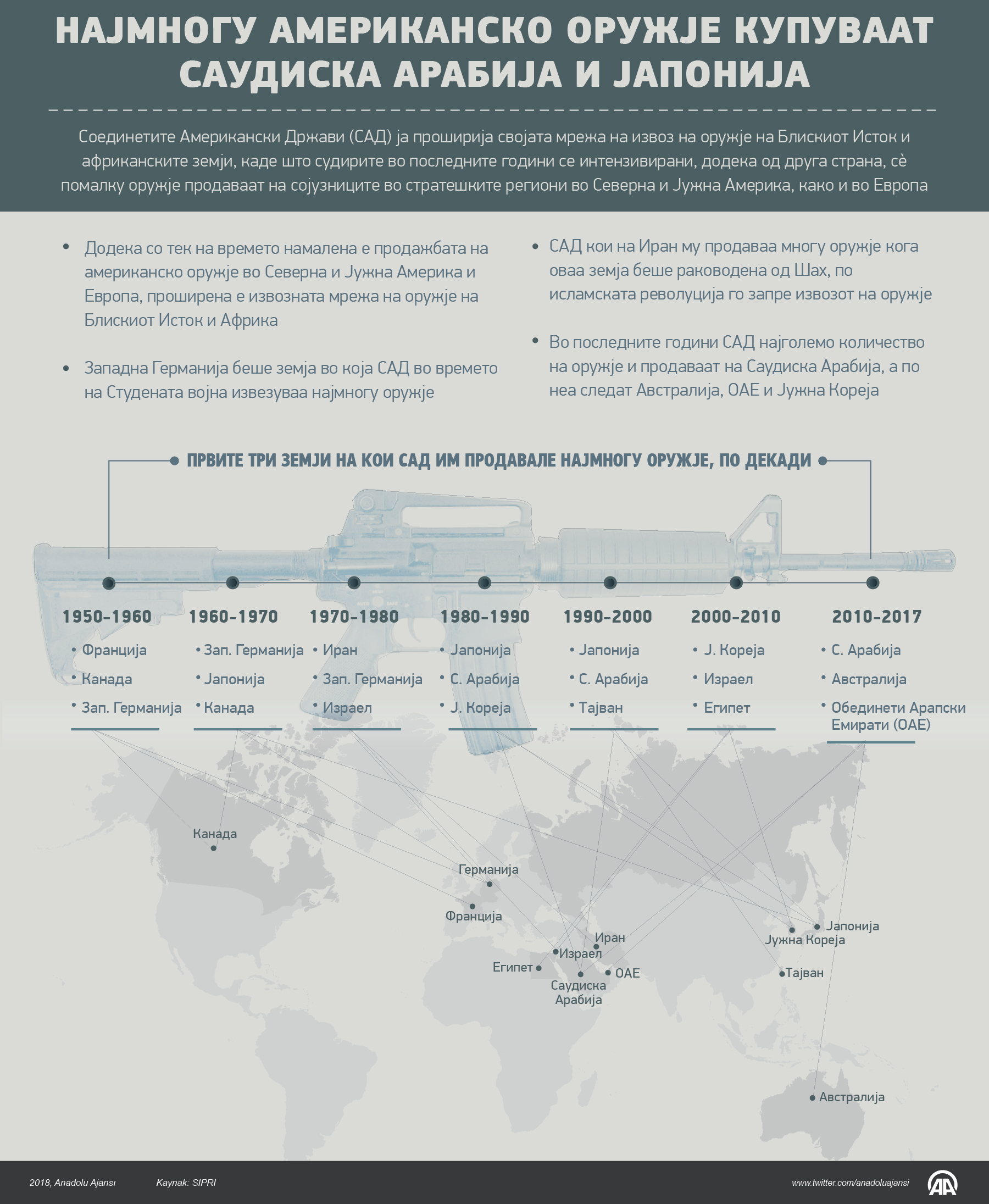 САД ја проширија својата мрежа на извоз на оружје на Блискиот Исток и африканските земји, каде што судирите во последните години се интензивирани, додека од друга страна, сè помалку оружје продаваат на сојузниците во стратешките региони во Северна и Јужна Америка, како и во Европа