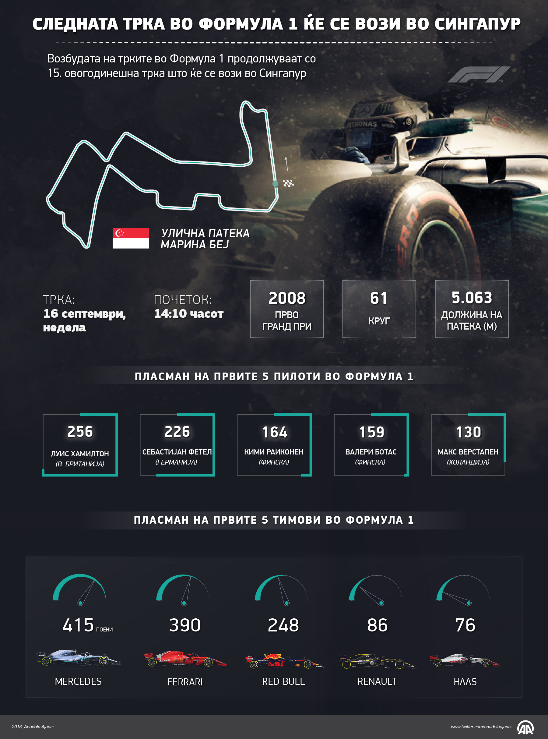 Петнаесеттата трка во сезоната на Формула 1 ГП шампионатот за Големата награда на Сингапур ќе се вози во недела, на 16 септември, а трката за пол позициите е во сабота 14 Септември 2018•Ажурирај: 14 Септември 2018