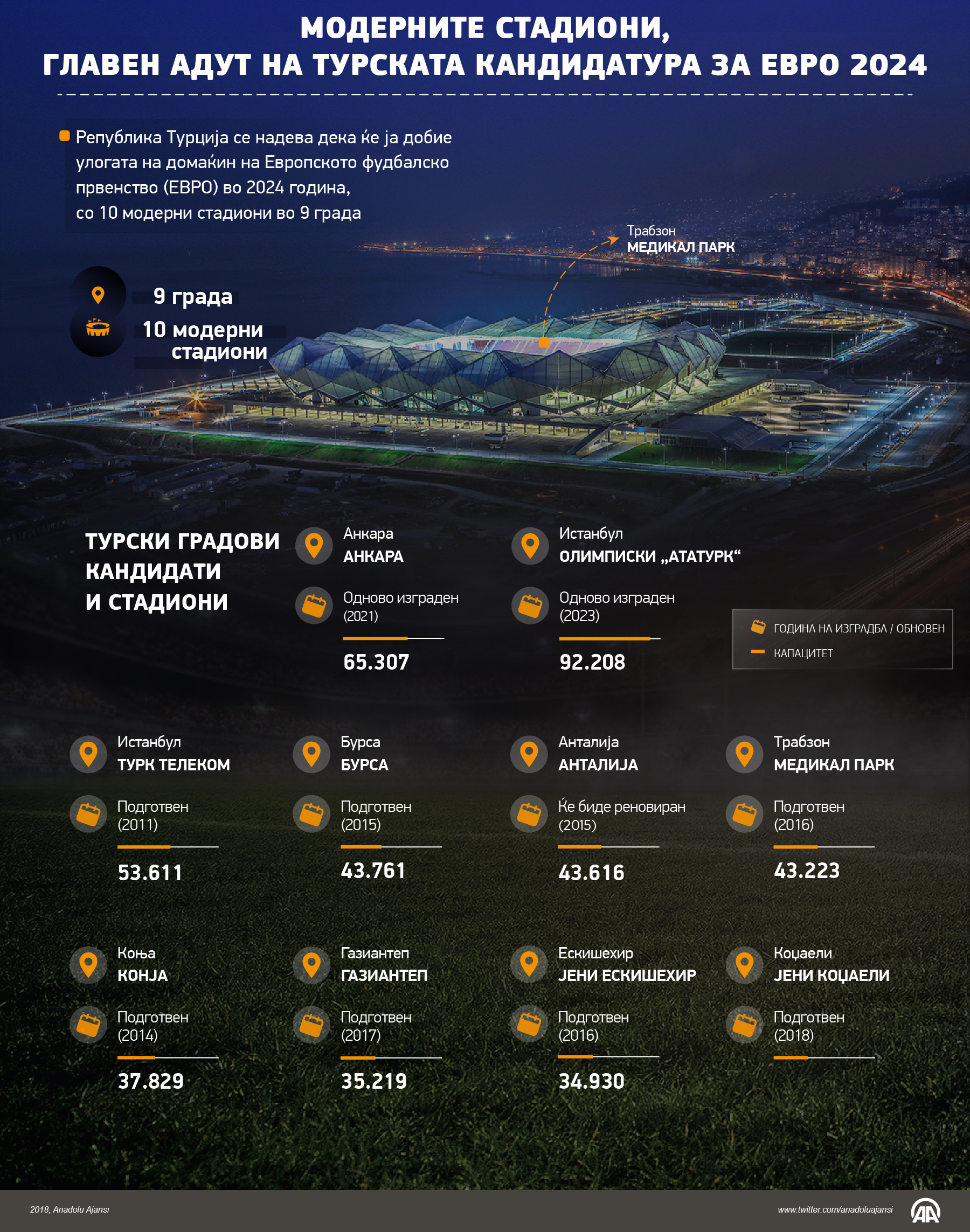 Република Турција се надева дека ќе ја добие улогата на домаќин на Европското фудбалско првенство (ЕВРО) во 2024 година, во четвртата последователна кандидатура за домаќин на смотрата на најдобри нации на Стариот Континент25 Септември 2018•Ажурирај: 25 Септември 2018