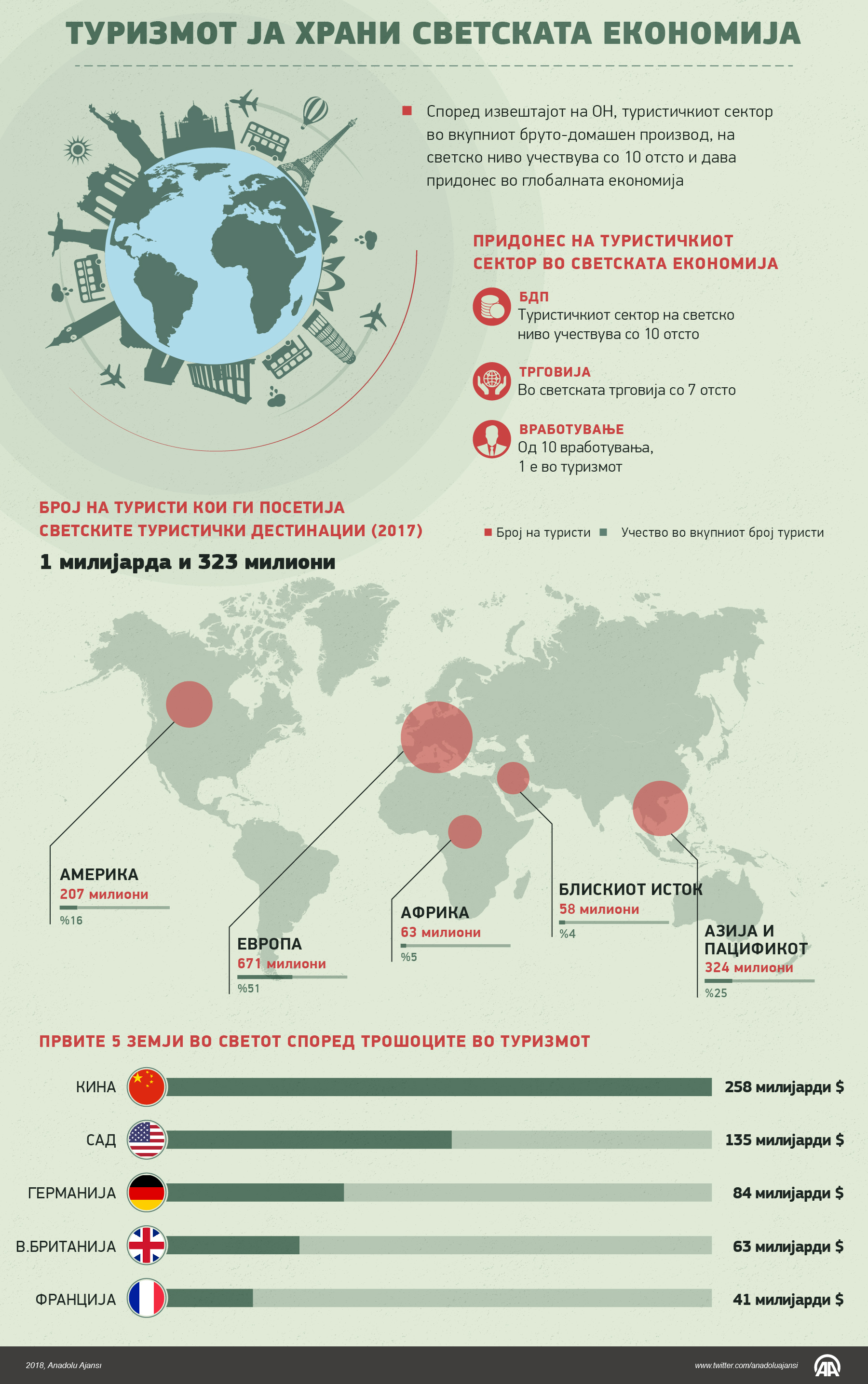Според извештајот на ОН, туристичкиот сектор во вкупниот бруто-домашен производ, на светско ниво учествува со 10 отсто, а во светската трговија со 7 отсто. Од секои 10 вработувања, едно е во туризмот.