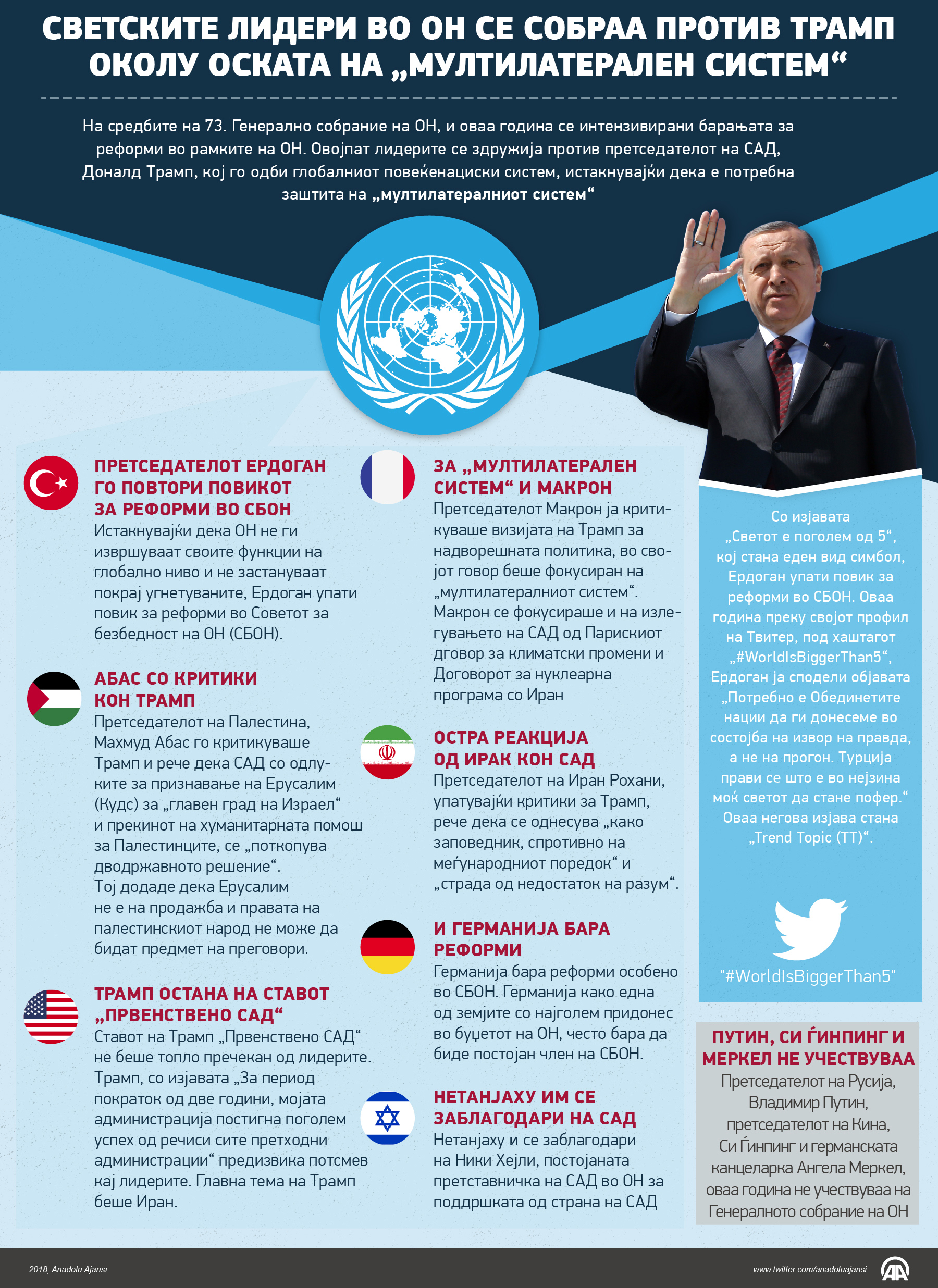 Иако на Генералното собрание на ОН на дневен ред беа Сирија, излегувањето на администрацијата на Трамп од Договорот за нуклеарната програма со Иран и Договорот за климатските промени, барањата за реформи за повеќе глобални прашања, оваа година во фокусот на дискусиите на 193 члена на ОН беше „мултилатералниот систем“, заштитата и одржувањето на глобалната соработка.