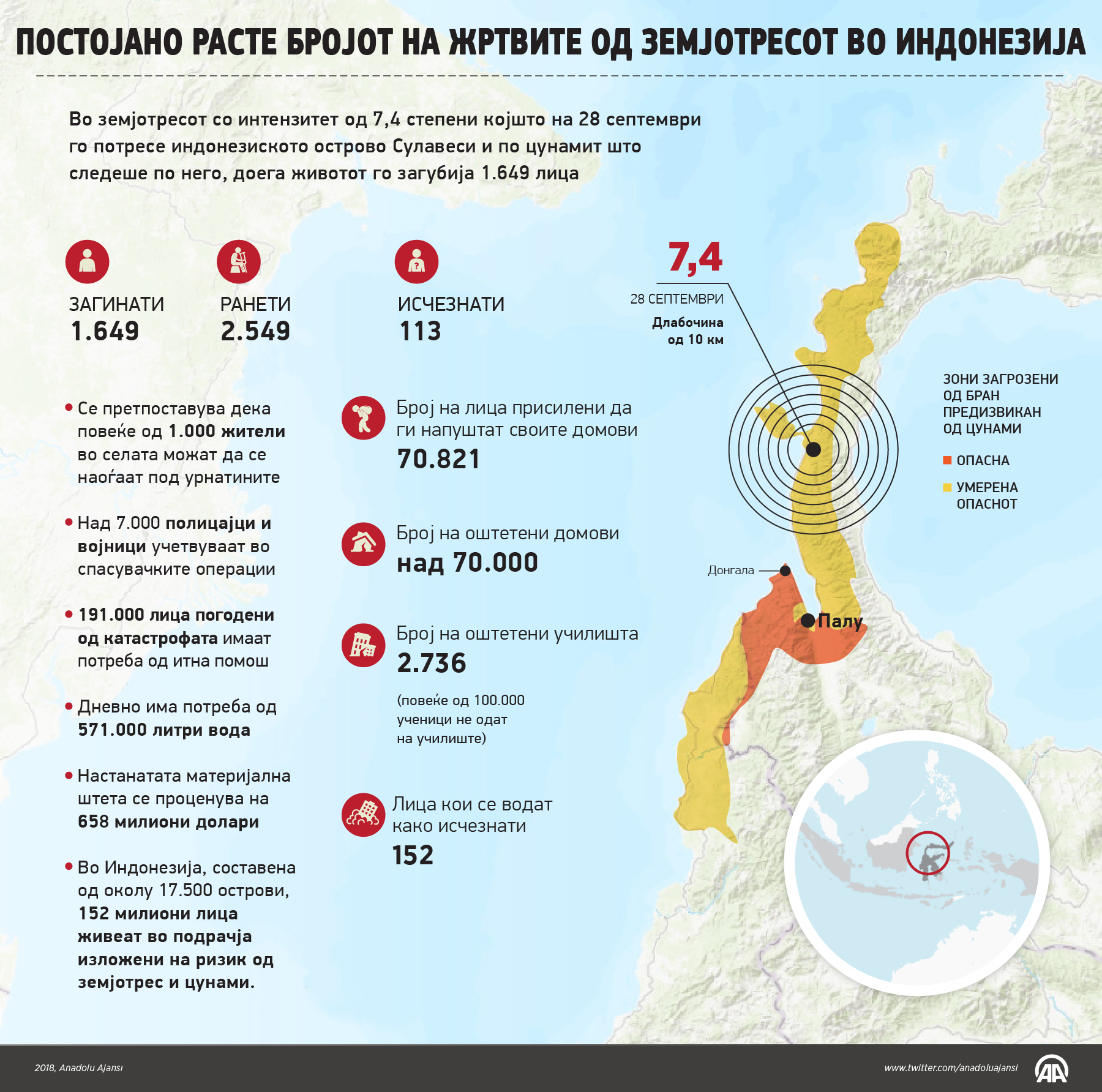 Агенцијата за справување со катастрофи (BNPB) на Индонезија објави дека бројот на жртви од минатонеделниот земјотрес и цунами што го погоди островот Сулавеси, пораснал на 1.649 лица, 06 Октомври 2018•Ажурирај: 06 Октомври 2018