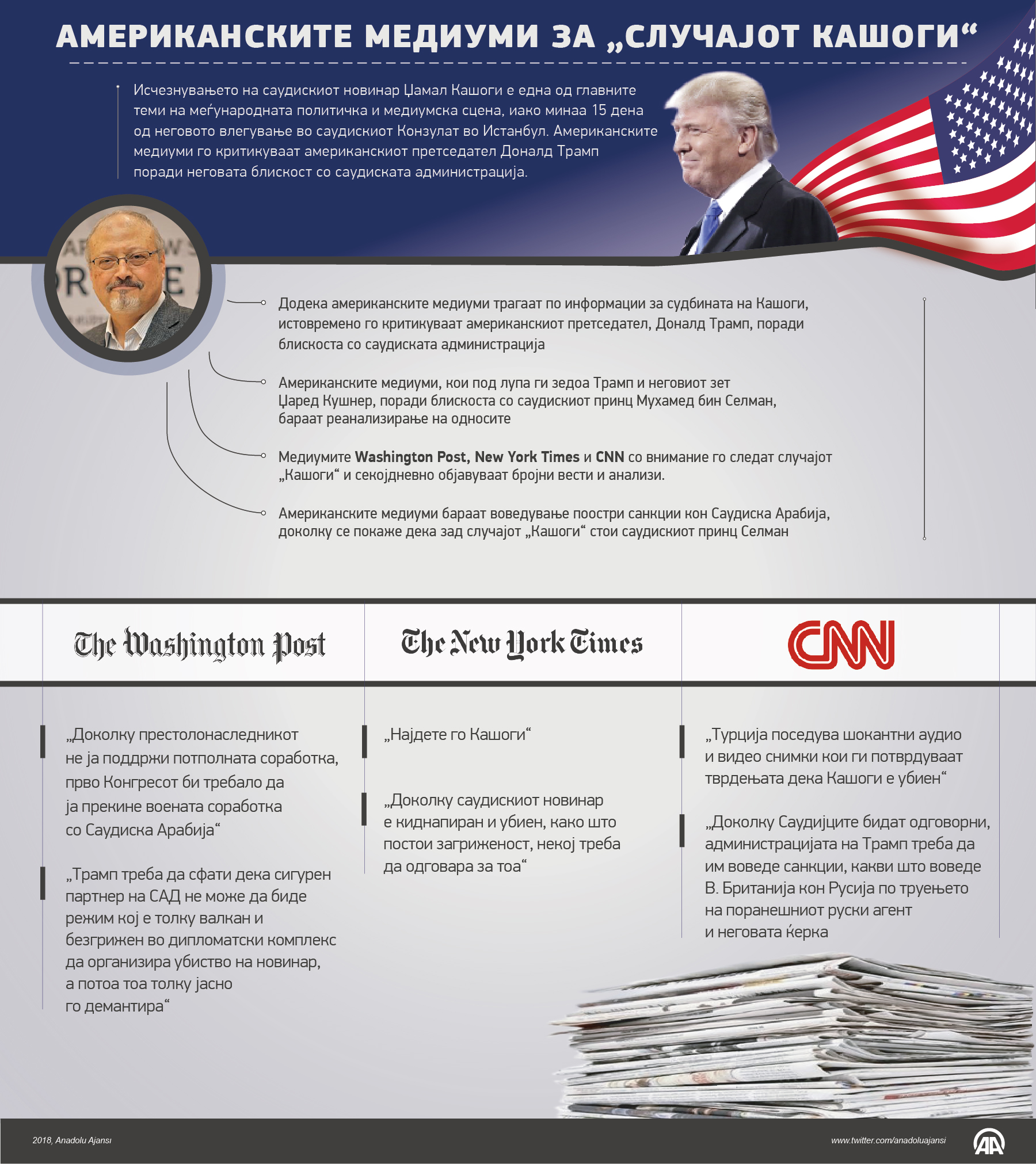 Исчезнувањето на саудискиот новинар Џамал Кашоги е една од главнитетеми на меѓународната политичка и медиумска сцена, иако минаа 15 дена од неговото влегување во саудискиот Конзулат во Истанбул. Американските медиуми го критикуваат американскиот претседател Доналд Трамп поради неговата блискост со саудиската администрација.18 Октомври 2018•Ажурирај: 18 Октомври 2018