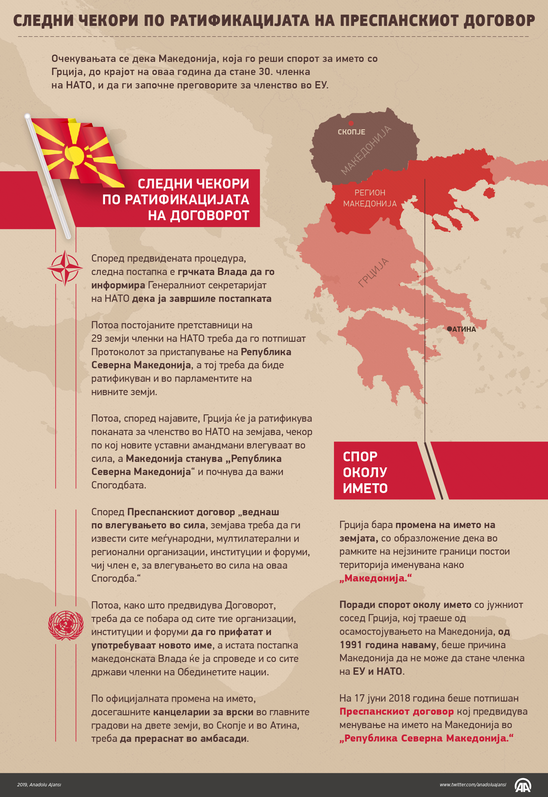 - Според предвидената процедура, Грција ќе ја ратификува поканата за членство во НАТО на земјава, чекор по кој новите уставни амандмани влегуваат во сила, а Македонија станува Република Северна Македонија и почнува да важи Спогодбата.29 Јануари 2019•Ажурирај: 29 Јануари 2019