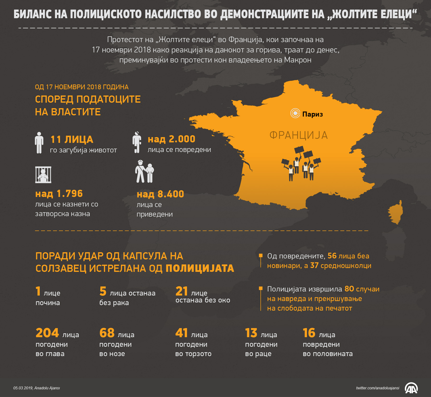 - Во Франција, во демонстрациите на „Жолтите елеци“, кои траат повеќе од 3 месеци, со капсула од солзавец користен од страна на полицијата, едно лице го загуби својот живот, а 368 лица беа повредени