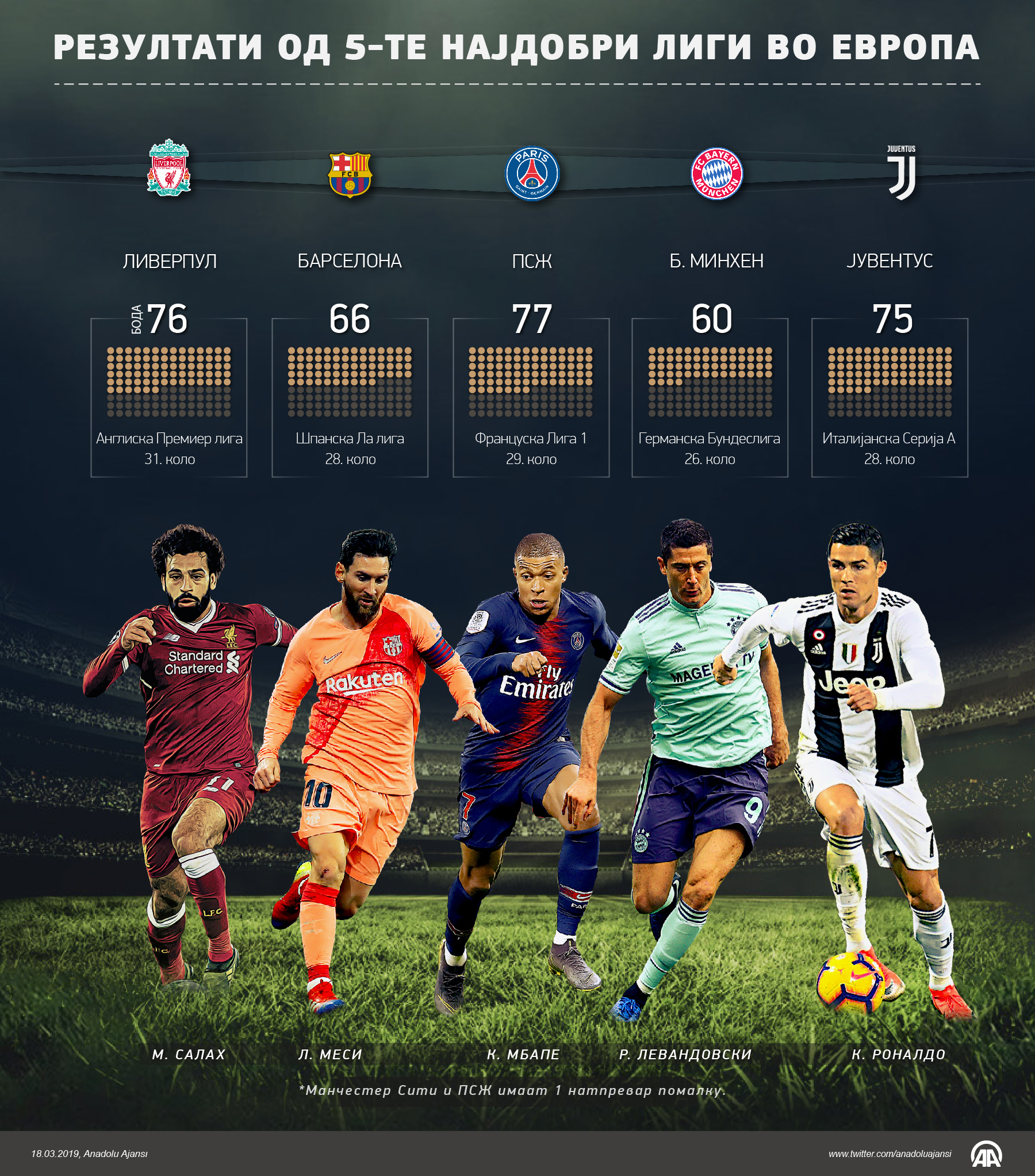 - Викендов се одиграа натпревари во 5-те најдобри европски фудбалски лиги, Премиер лига, Ла лига, Буденслига, Серија А и Лига 1. Во Англија на првата позиција се наоѓа Ливерпул, во Шпанија Барселона, во Италија Јувентус, во Германија Баерн Минхен, додека во Франција лидерската позиција му припаѓа на Пари Сен Жермен (ПСЖ).18 Март 2019•Ажурирај: 18 Март 2019