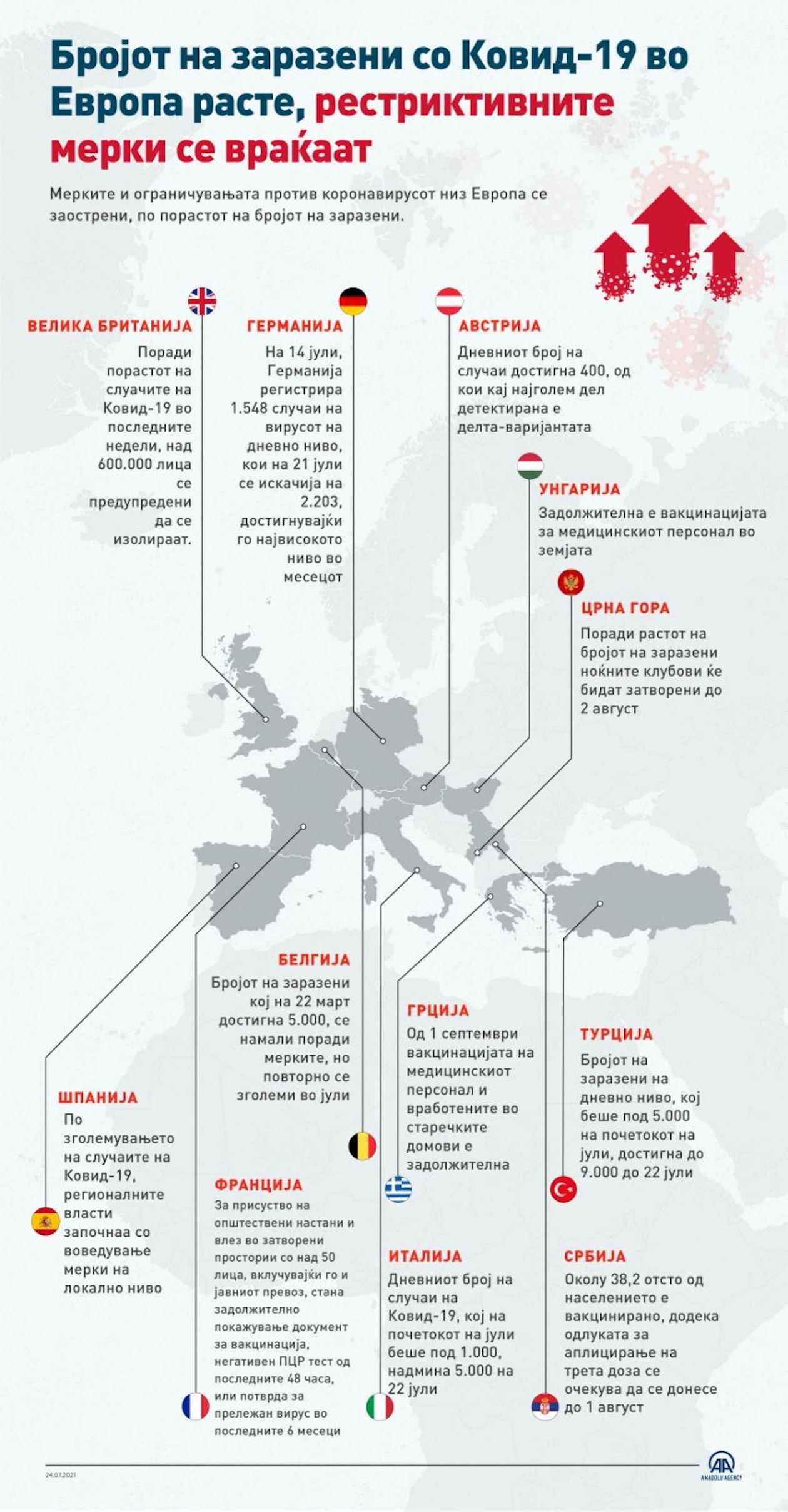 Како резултат на растот од бројот на случаи со Ковид-19 низ Европската Унија (ЕУ), земјите усвојуваат нови мерки и ги заоструваат постојните ограничувања за спречување на ширењето. 25 Јули 2021•Ажурирај: 25 Јули 2021