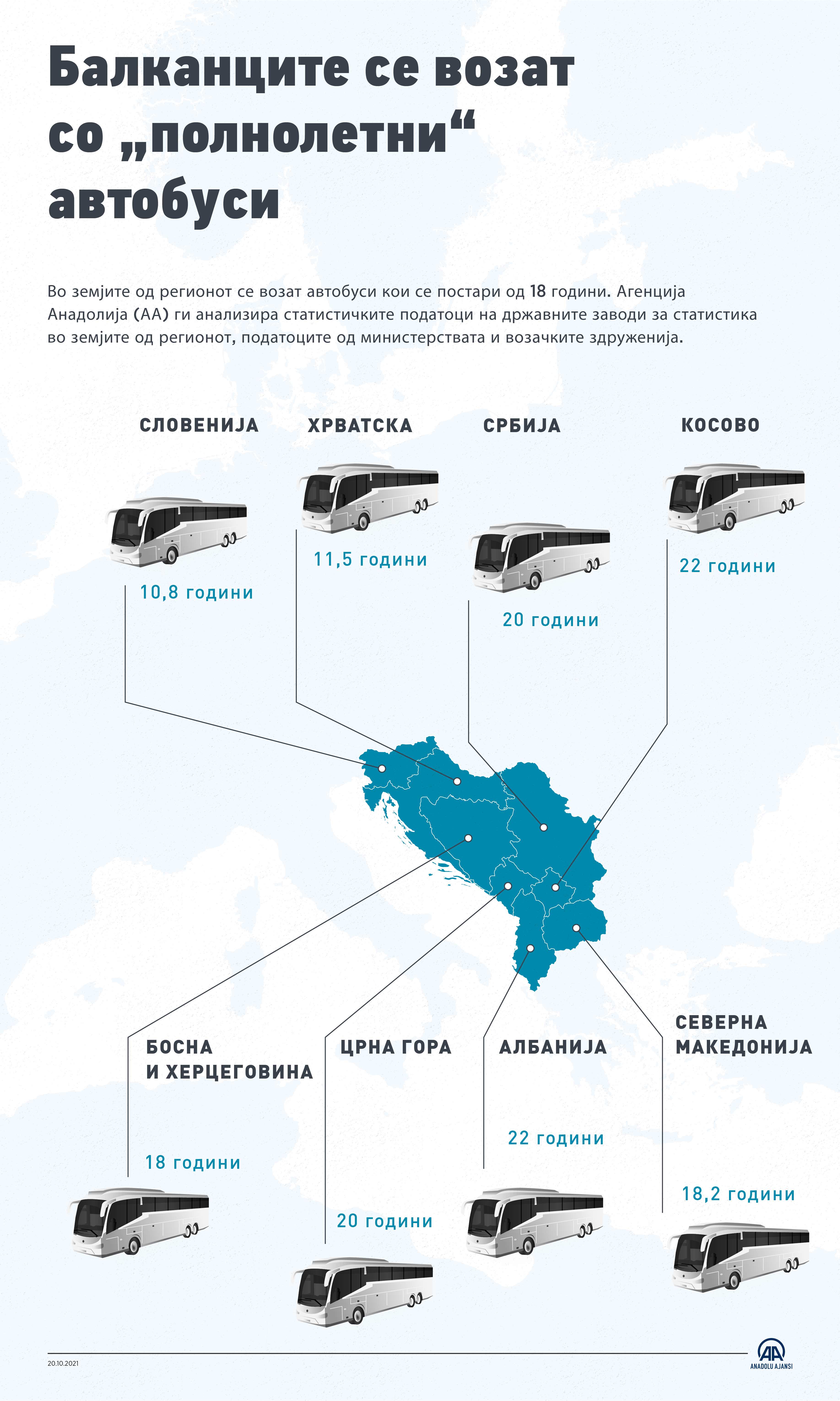 Во земјите од регионот се возат автобуси кои се постари од 18 години. Агенција Анадолија (АА) ги анализираше статистичките податоци на државните заводи за статистика во земјите од регионот, податоците од министерствата и возачките здруженија. 26 Ноември 2021•Ажурирај: 26 Ноември 2021