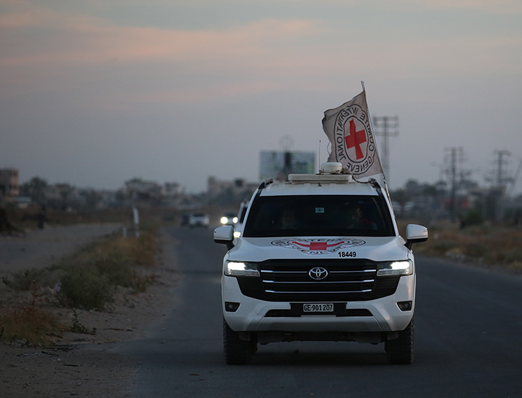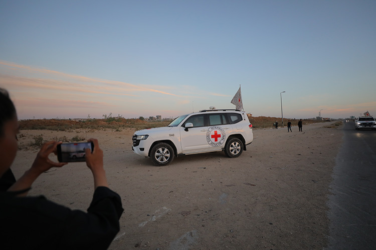 Израильское государственное телевидение KAN показало кадры, на которых запечатлены автомобили, принадлежащие делегации Красного Креста, доставившей Александра, когда они покидали Хан-Юнус.