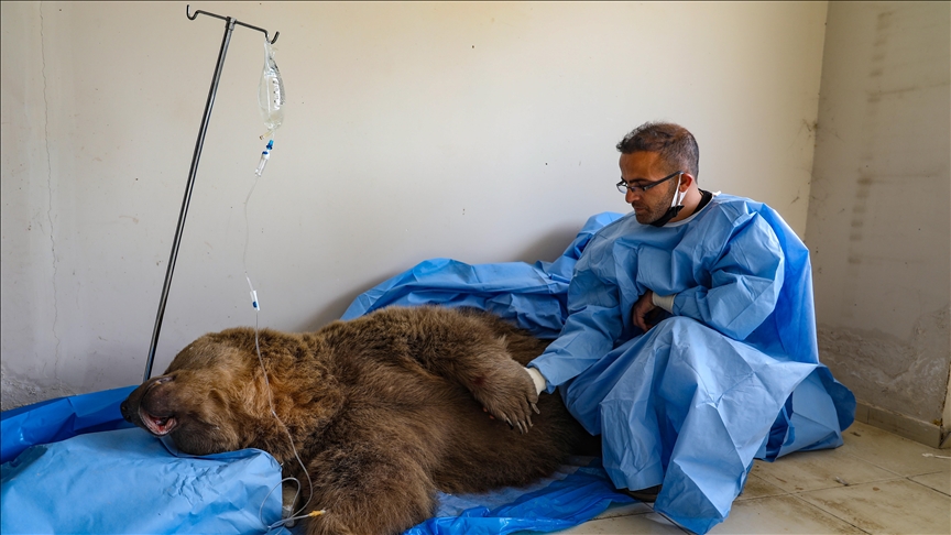 В районе Чалдыран провинции Ван на востоке Турции врачи-ветеринары пытаются спасти жизнь медведя, которого накануне сбила машина.
