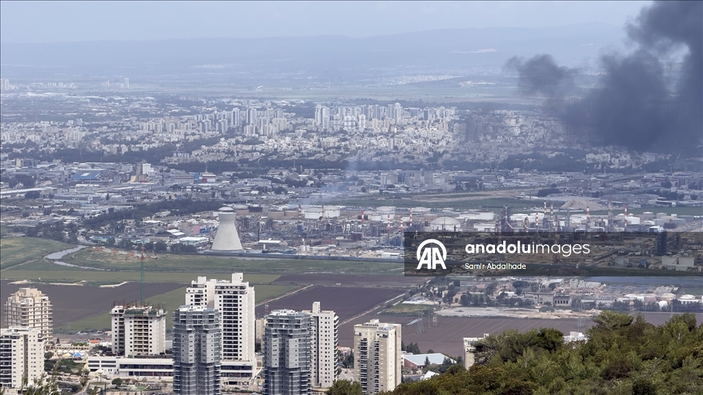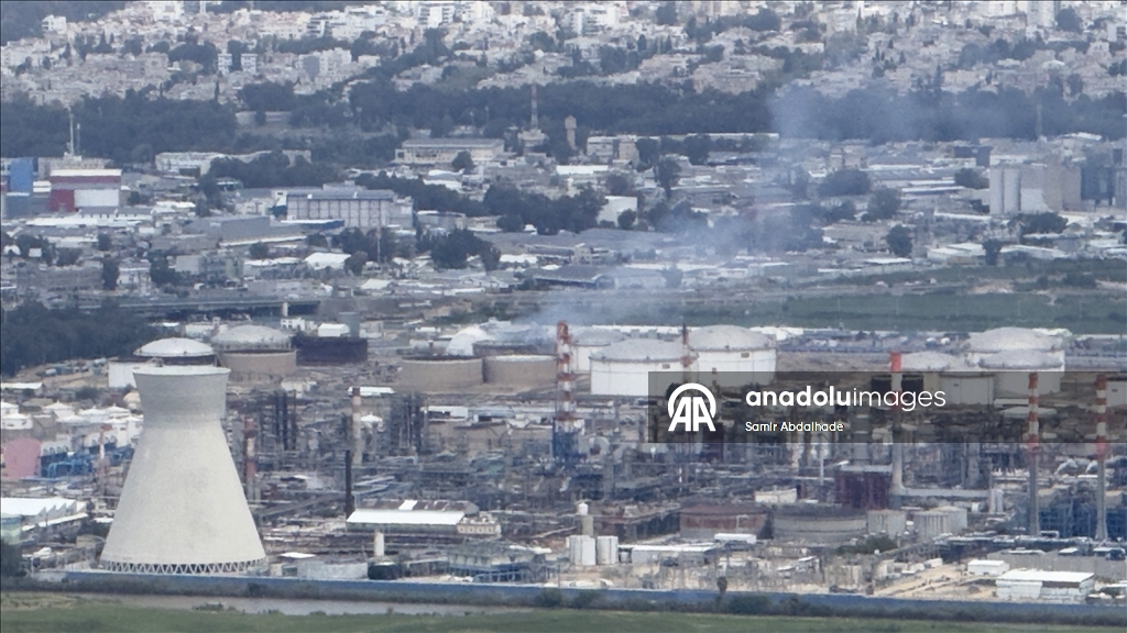 После одновременных ответных ударов Ирана и ливанского движения «Хезболла» над территорией нефтеперерабатывающего комплекса в израильском городе Хайфа поднимаются клубы дыма.