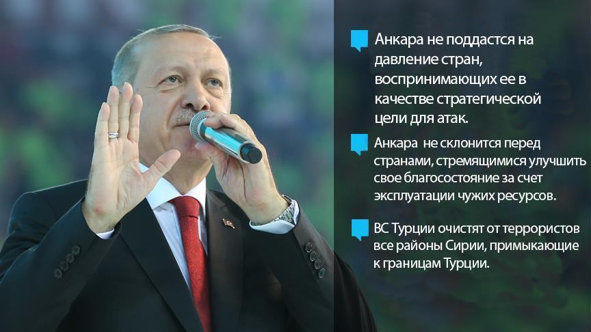 Глава государства отметил, что Турция не склонится перед державами, стремящимися улучшить свое благосостояние за счет эксплуатации ресурсов других стран. «Анкара не поддастся на давление государств, которые называя Турцию стратегическим партнером, воспринимают нашу страну в качестве стратегической цели для давления», - сказал президент.