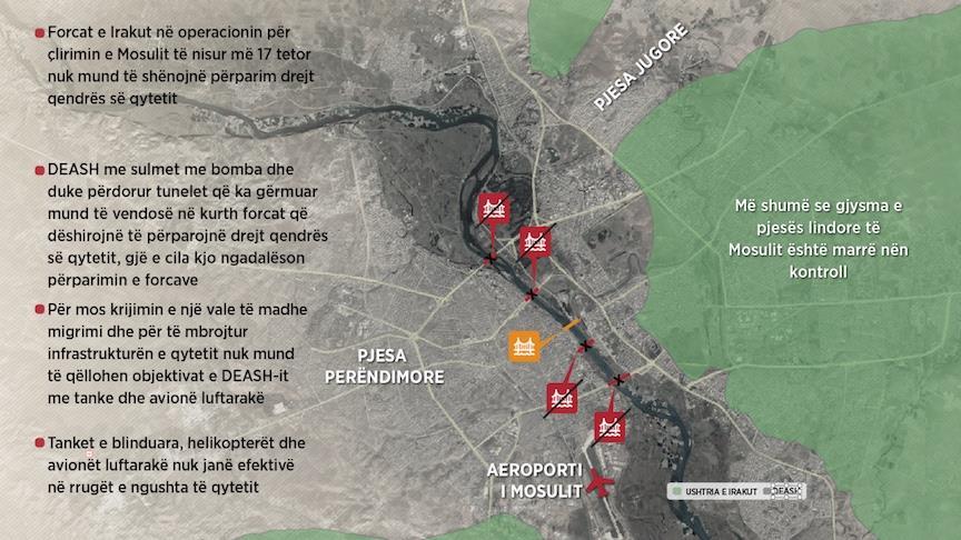 Pavarësisht se forcat irakiane kanë nisur më 17 tetor operacionin për çlirimin e Mosulit, nuk arrijnë të përparojnë për shkak të tuneleve që DEASH-i ka gërmuar dhe të cilat i përdor si mjetet më të fuqishme të mbrojtjes. Ndërsa bëhet e ditur gjithashtu se forcat e sigurisë nuk mund të përparojnë edhe për shkak të sulmeve me autobomba dhe sulmeve nga snajperët, ku krahas këtyre një shkak tjetër tregohet edhe prania e mbi 1 milionë civilëve që nuk braktisin shtëpitë e tyre ende në rajonin lindor dhe perëndimor të qytetit.