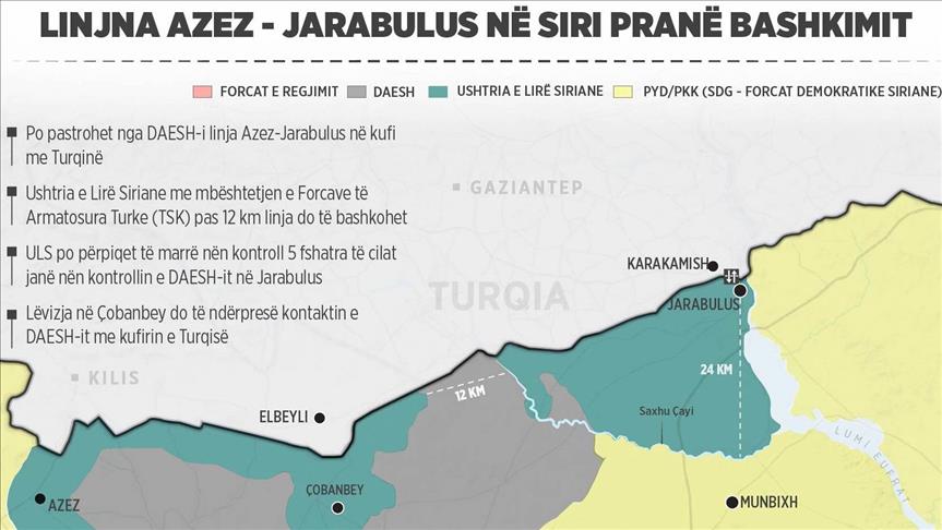 ELBEYLI (AA) – Ushtria e Lirë Siriane me mbështetjen e Forcave të Armatosura të Turqisë (TSK) vazhdon të pastrojë nga terroristët linjën Azez-Jarabulus të Sirisë e cila kontrollohet nga DAESH-i në kufi të Turqisë. Për lidhjen fizike mes dy rajoneve kanë mbetur 12 kilometra, raporton Anadolu Agency (AA).