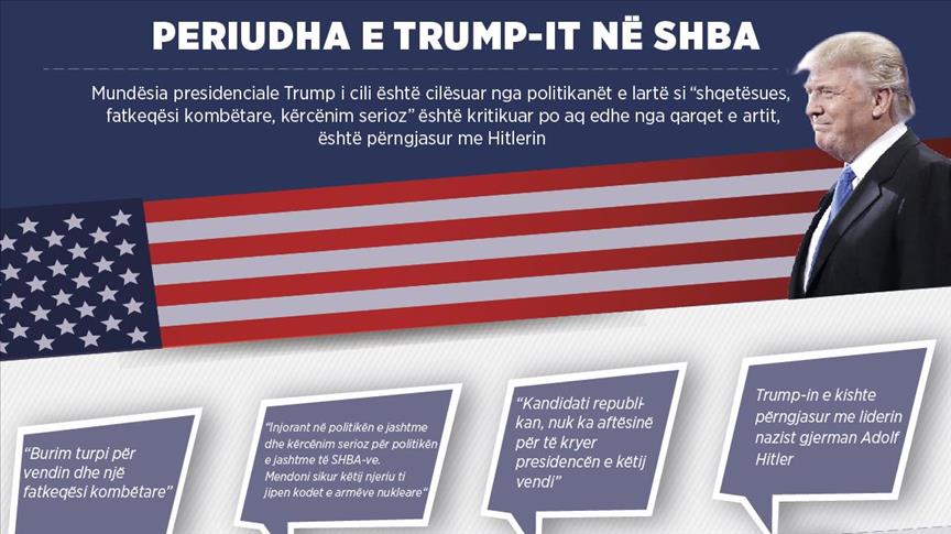 ANKARA (AA) - Donald Trump, fituesi i zgjedhjeve presidenciale në SHBA gjatë fushatës parazgjedhore pati fjalime të ashpra. Për shkak të qëndrimeve të tij ai u bë objekt i kritikave dhe shprehjeve ofenduese nga shumë persona të famshëm dhe politkanë. Trump pritet që edhe gjatë periudhës së presidencës të vazhdojnë këto debate, raporton Anadolu Agency (AA).